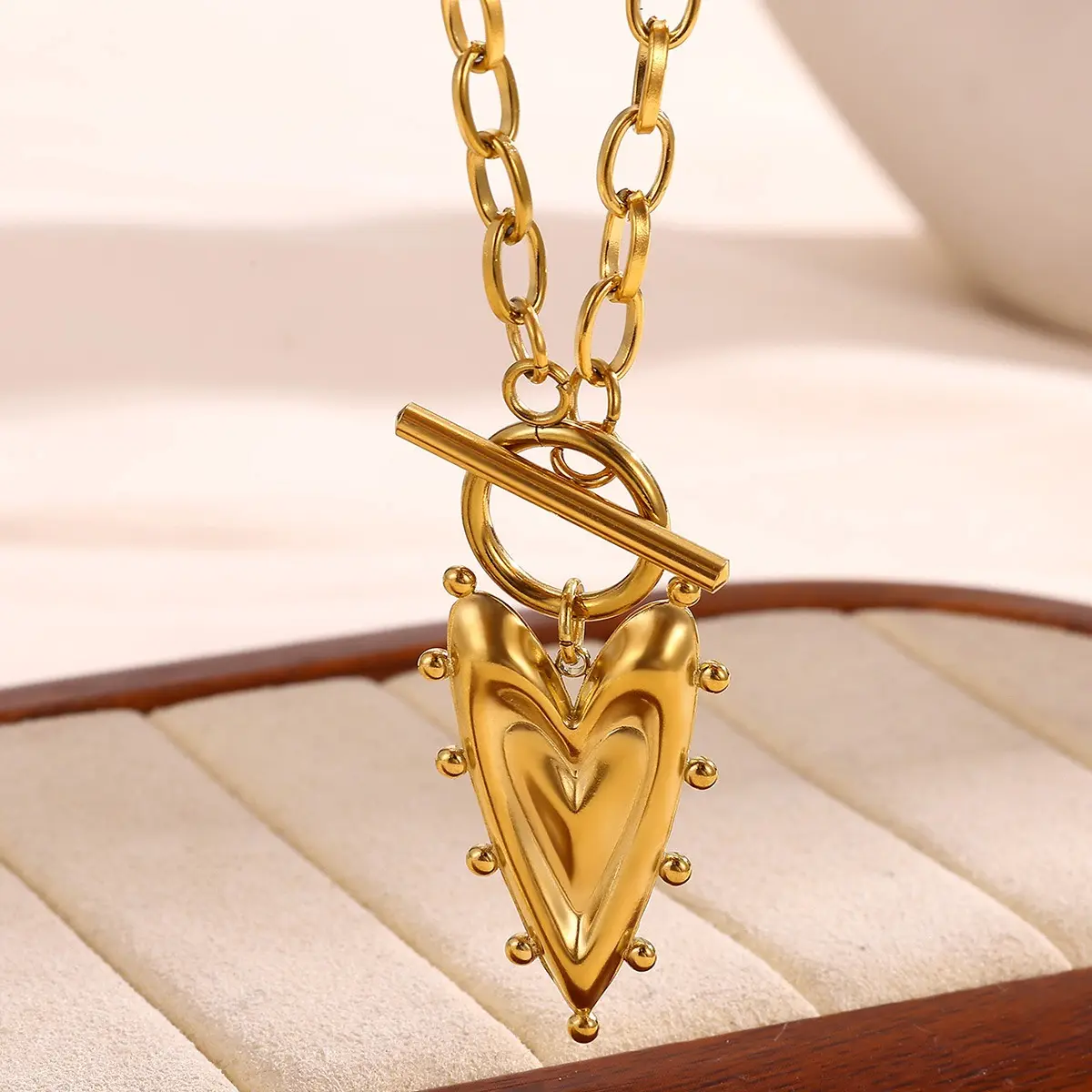 The "Gilded Layered Hearts" Toggle Necklace reimagines romantic symbolism through a vintage-inspired, substantial design. Featuring a three-dimensional, double-layered heart pendant—delicately edged with fine spherical beads—it is paired with a bold, chunky chain and a classic toggle clasp. This piece strikes a perfect balance between strength and softness, exuding an effortlessly chic yet bold aura that makes it an eye-catching statement accessory suitable for both daily wear and special occasions.