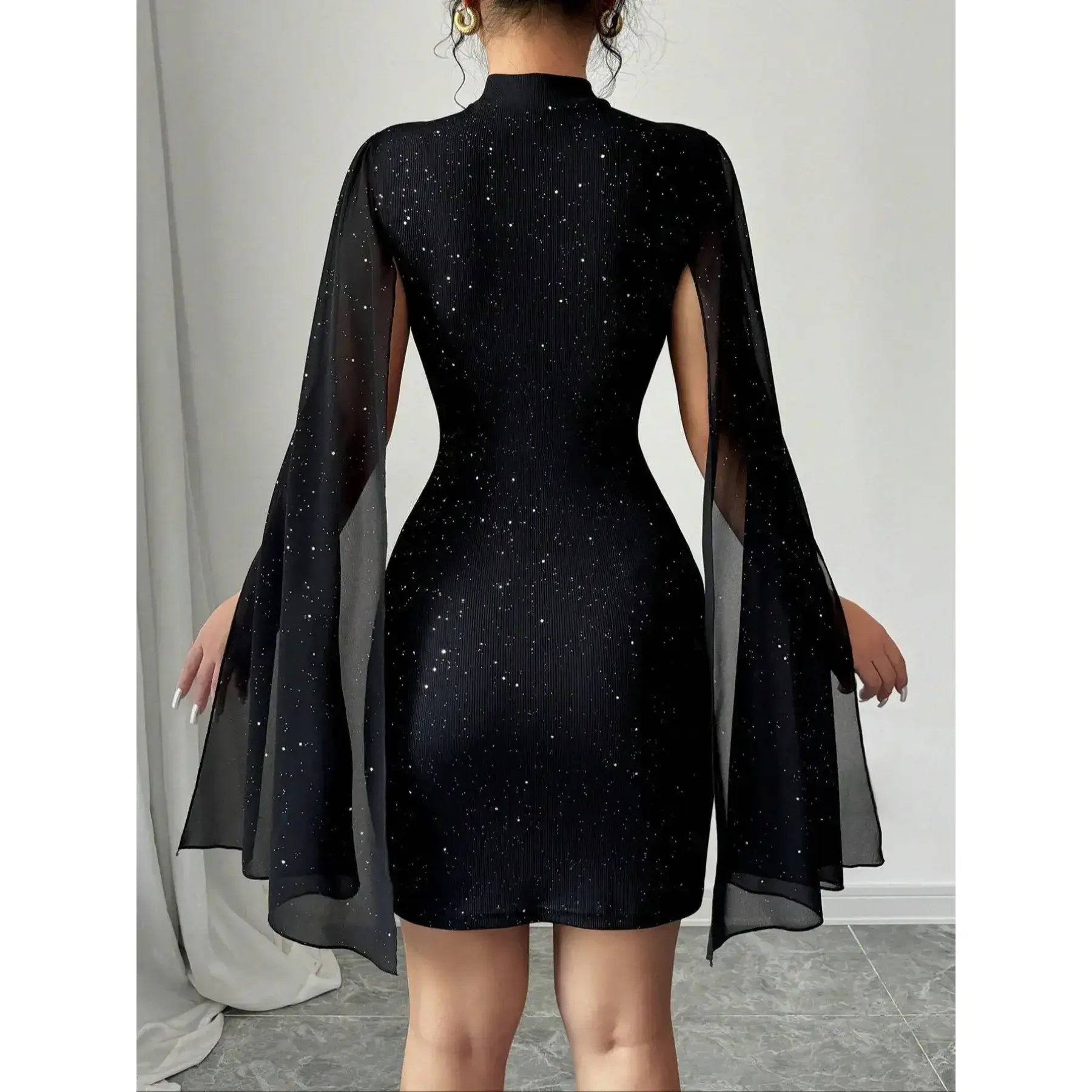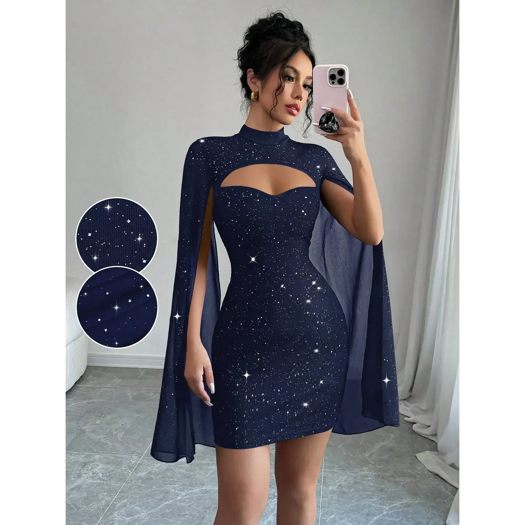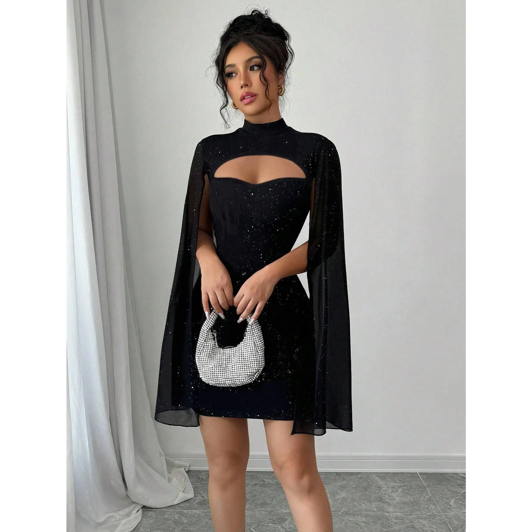 【Starry Sequins】: Adorned with sparkling sequins, this dress adds a glamorous touch perfect for parties and nightclubs. 【Stand Collar】: Features a stand collar design, providing a sophisticated and bold look for any occasion. 【Cutout Detail】: The cutout cape design offers a sexy and alluring appeal, ideal for date nights and events. 【Waist-Defining】: The fitted waist-definition ensures a flattering silhouette, enhancing your curves beautifully. 【Mini Skirt】: The bodycon mini skirt provides a snug fit, making it perfect for showcasing your outfit.