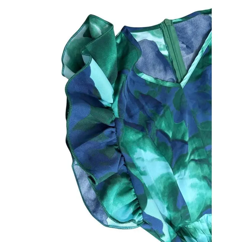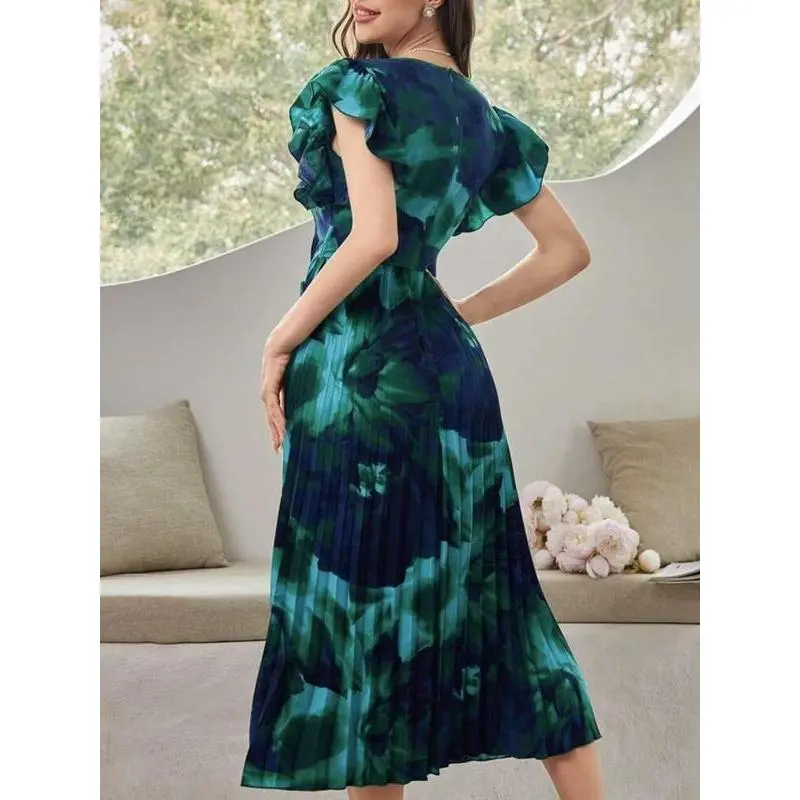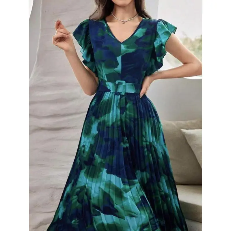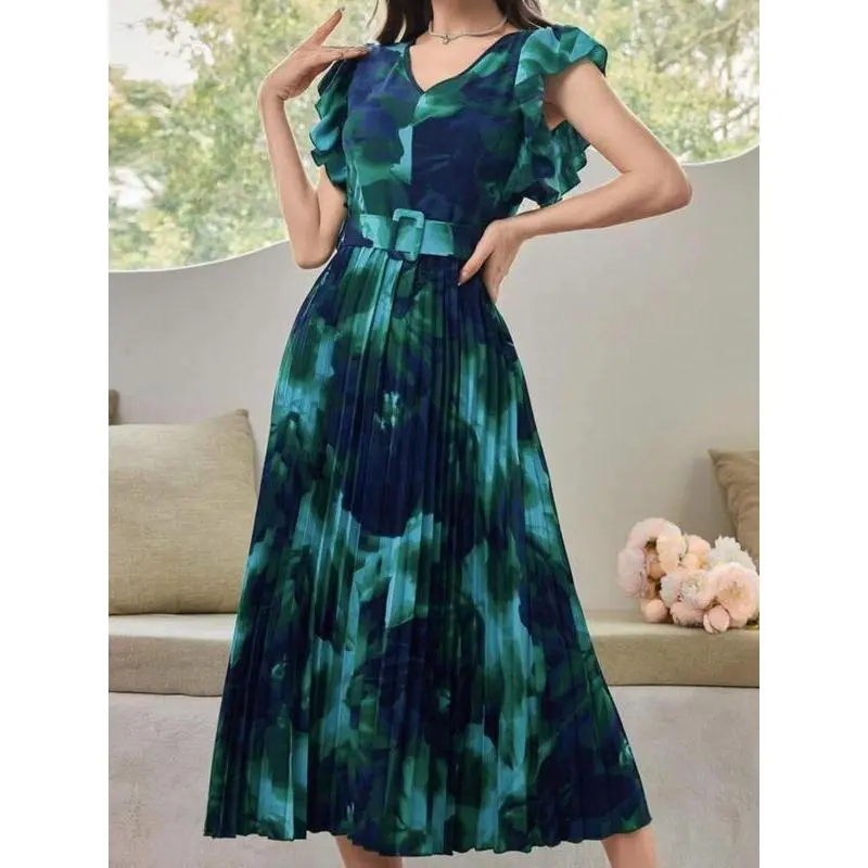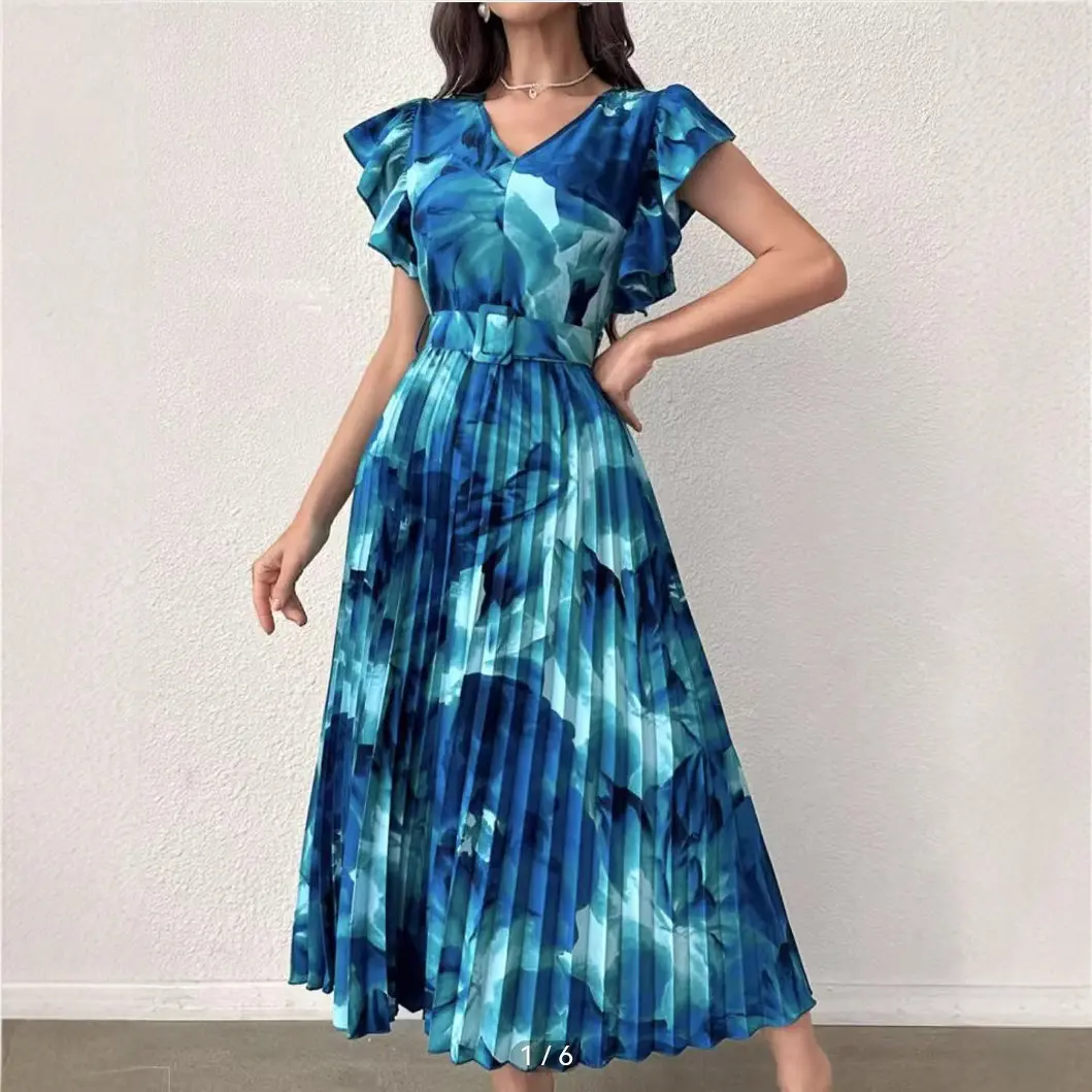 Women's All Over Print Belted Ruffle Pleated Butterfly Sleeve Dress, V Neck A Line Long Dress for Beach Holiday Vacation, Ladies Summer Clothes