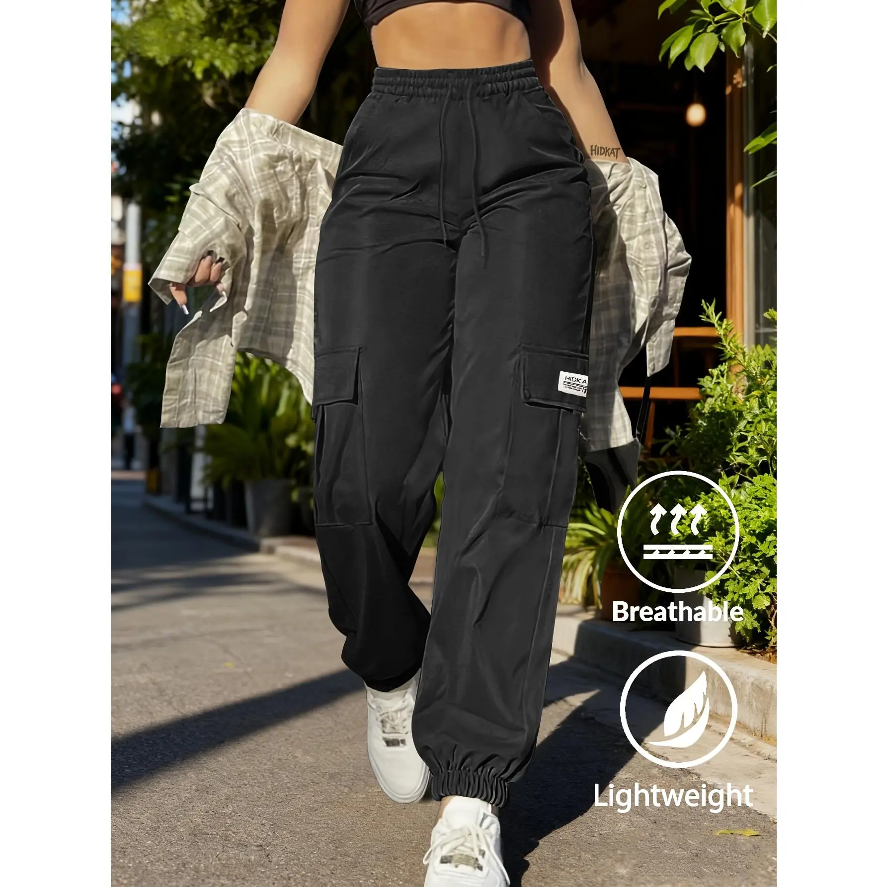 5. Women's Trendy Solid Color Cargo Pants Non-Stretch Fabric Drawstring Waist Roomy Utility Pockets Streetwear Sports Daily Trousers