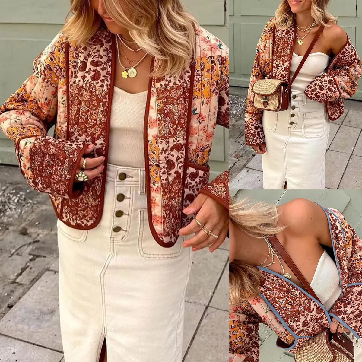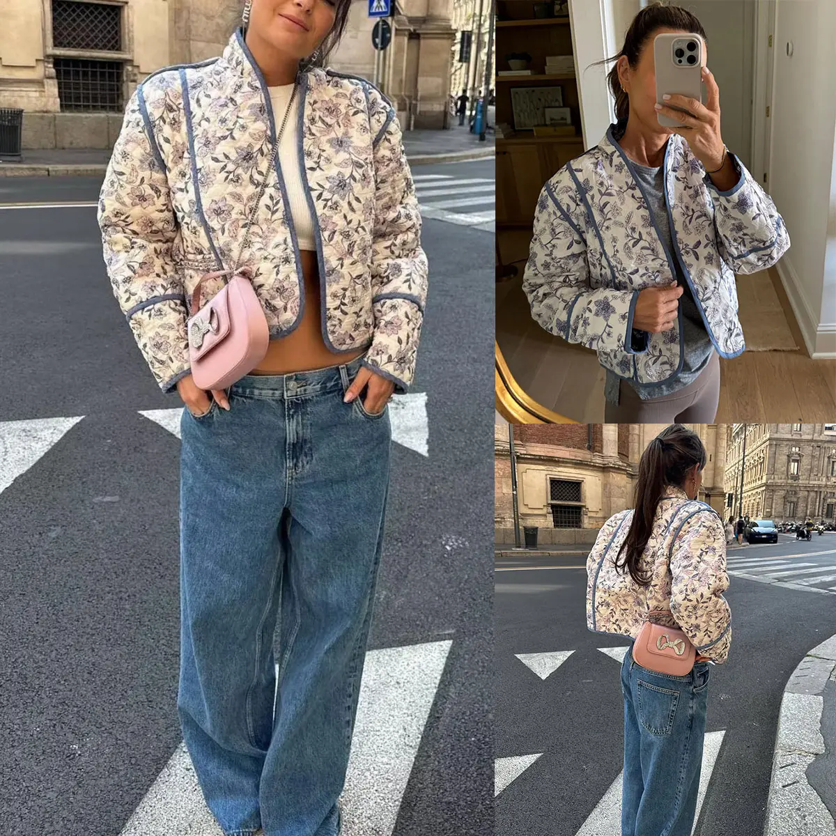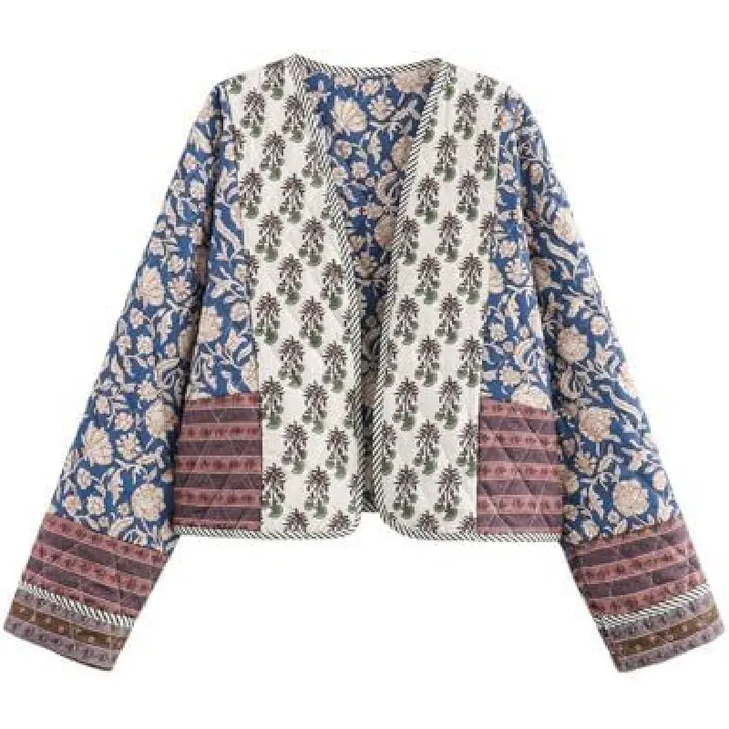 Women's Cropped Floral Quilted Jacket Cardigan Printed Lightweight Open Front Padded Puffer Coat-New Products