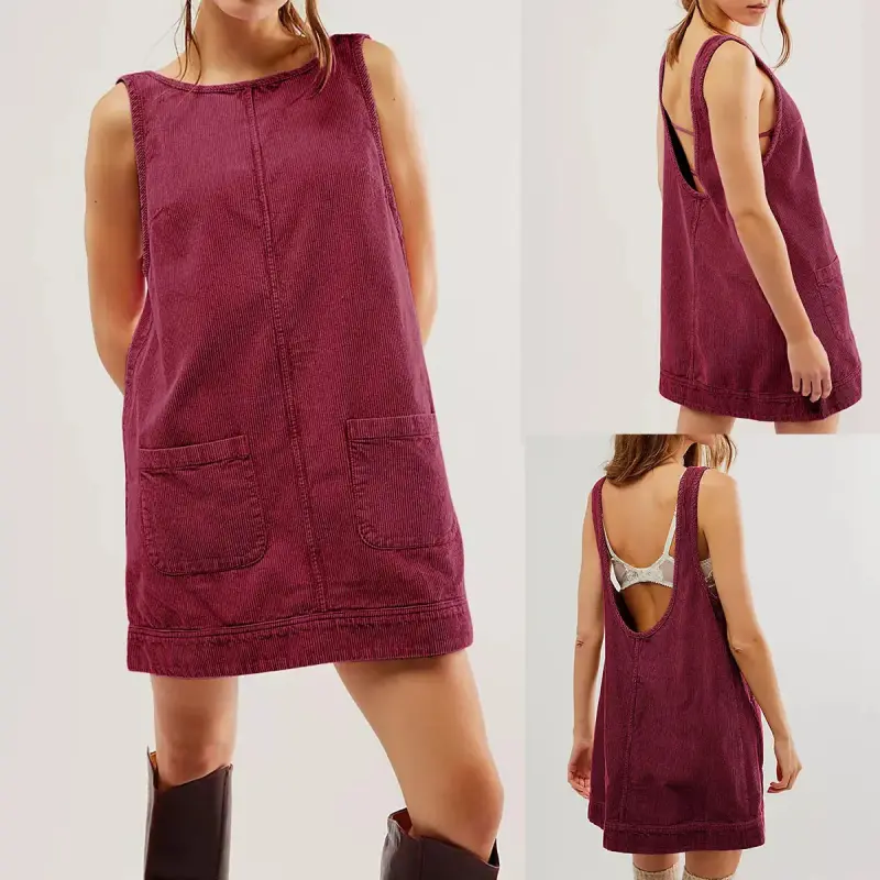 So cool in corduroy, this staple mini dress is featured in a mini length and sleeveless design with a low scoop back and two patch pockets at front