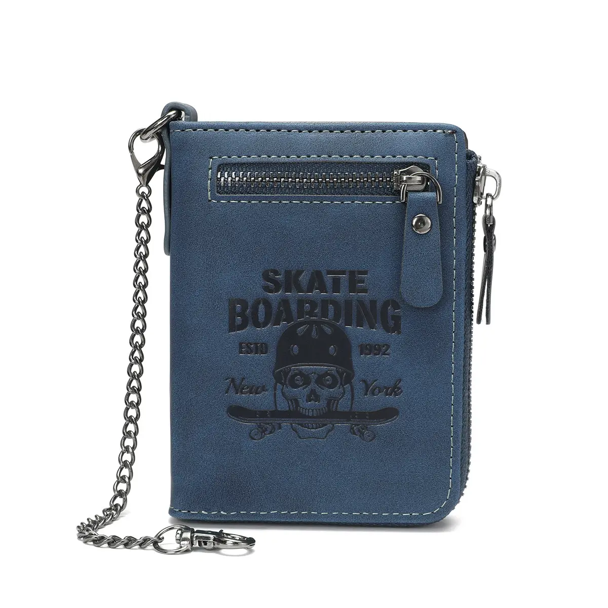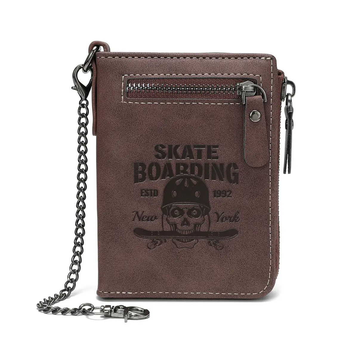 This bifold PU leather wallet is a rock-style essential for men. It features a skull embossed design with "Skateboarding Est. 1992 New York" text. Perfect for credit cards and cash, it offers multiple slots for organization. The wallet includes a money clip for added convenience. Ideal for everyday use, it combines style with functionality.