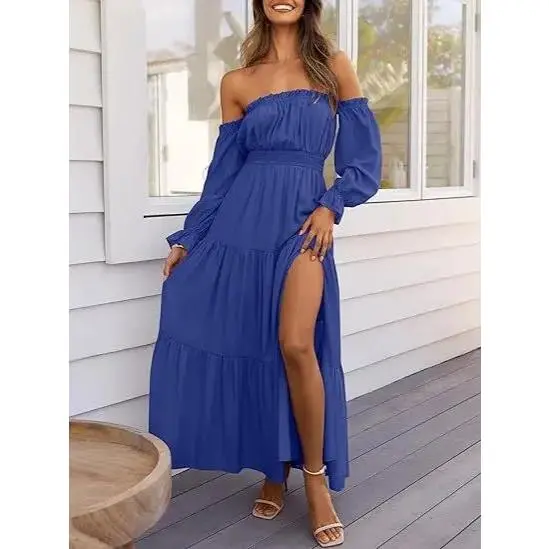 Fated Finds Summer Casual Dress, Women's Boho Sexy Off Shoulder Long Sleeve Smocked High Waist Side Split Flowy A-Line Tiered Maxi Dress, Elegant Backless – Please Check Size Chart, Runs Small (Size Up Recommended)