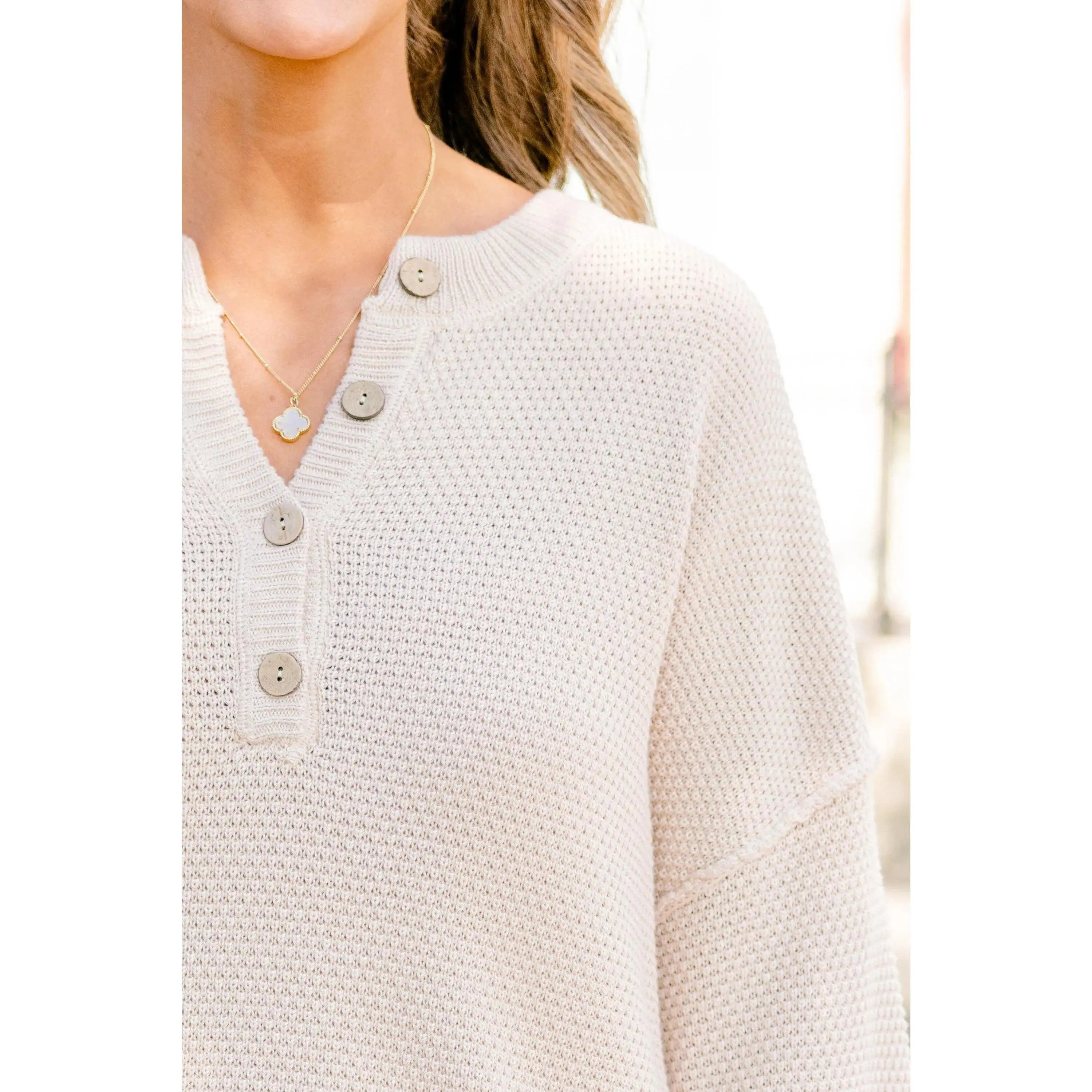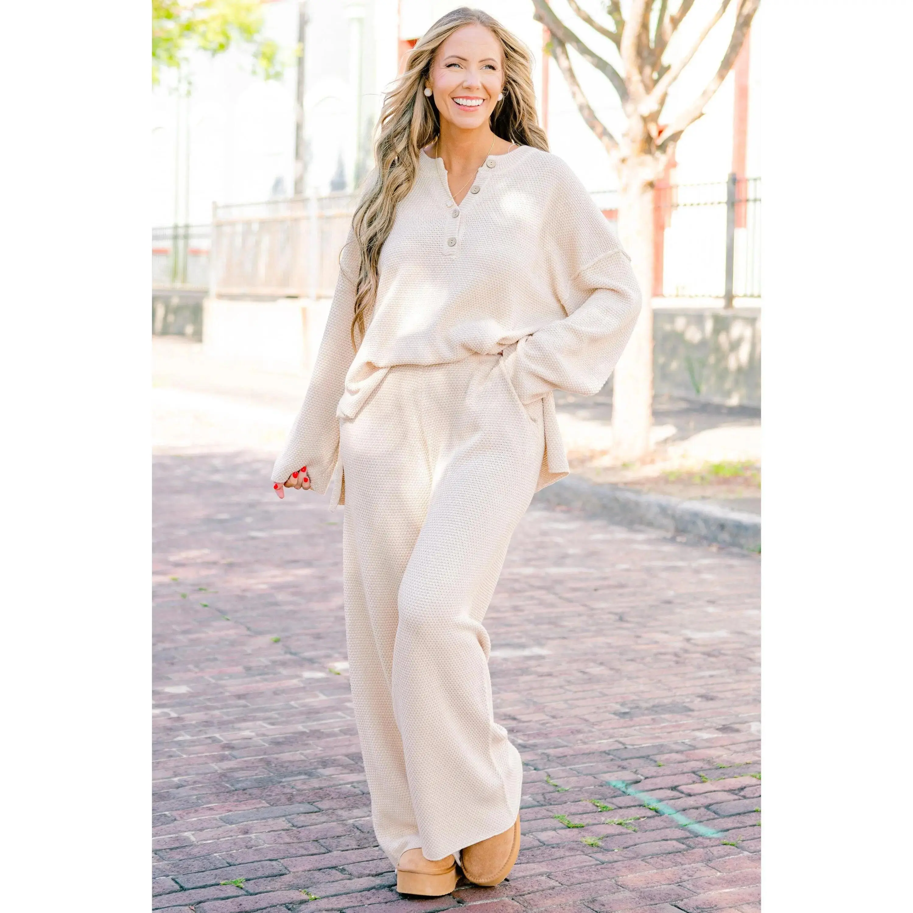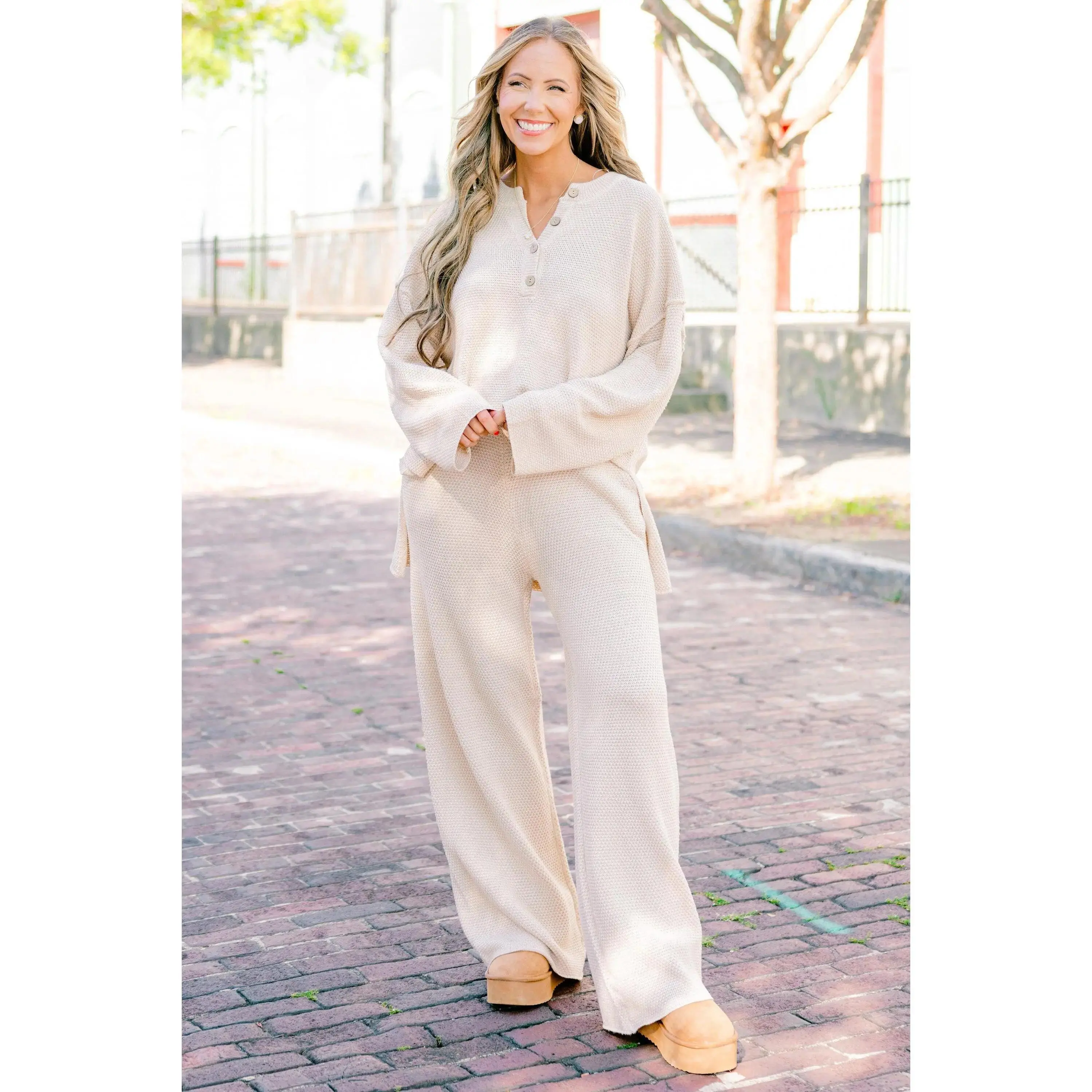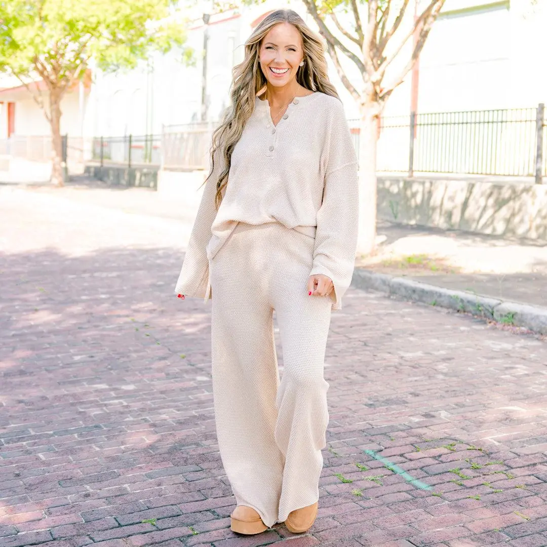 Gone Wild Set, Cream Knit Duo with Elastic Waist Pockets & V-Neck Buttons for Comfortable Casual Outings