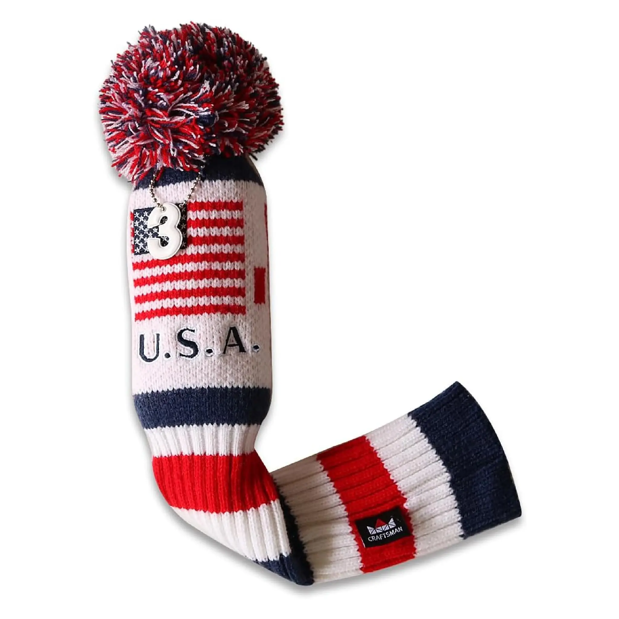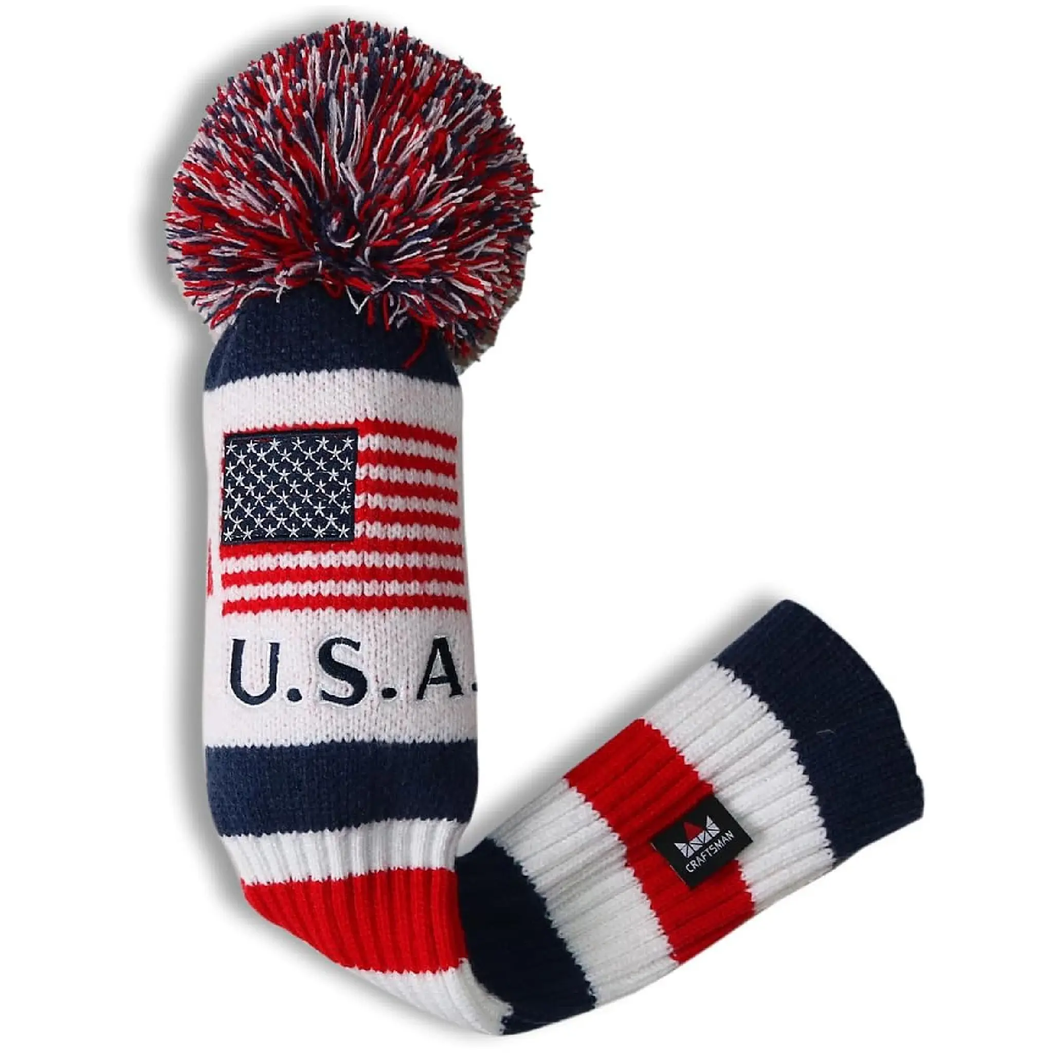 Craftsman Golf USA Flag Retro Knit Pom Pom Headcover - Patriotic Red White & Blue Protection for Driver, Fairway Wood & Hybrids