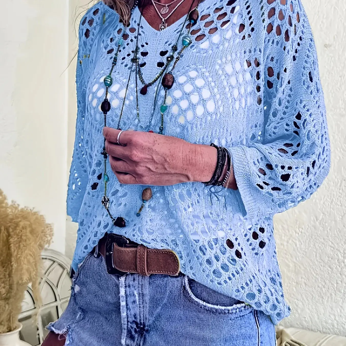 Women's Bohemian-Style Beige Crochet Top | New Spring/Summer Arrival: V-Neck, Openwork Diamond Pattern, Batwing Sleeve Knit Cover-Up (Loose Fit)