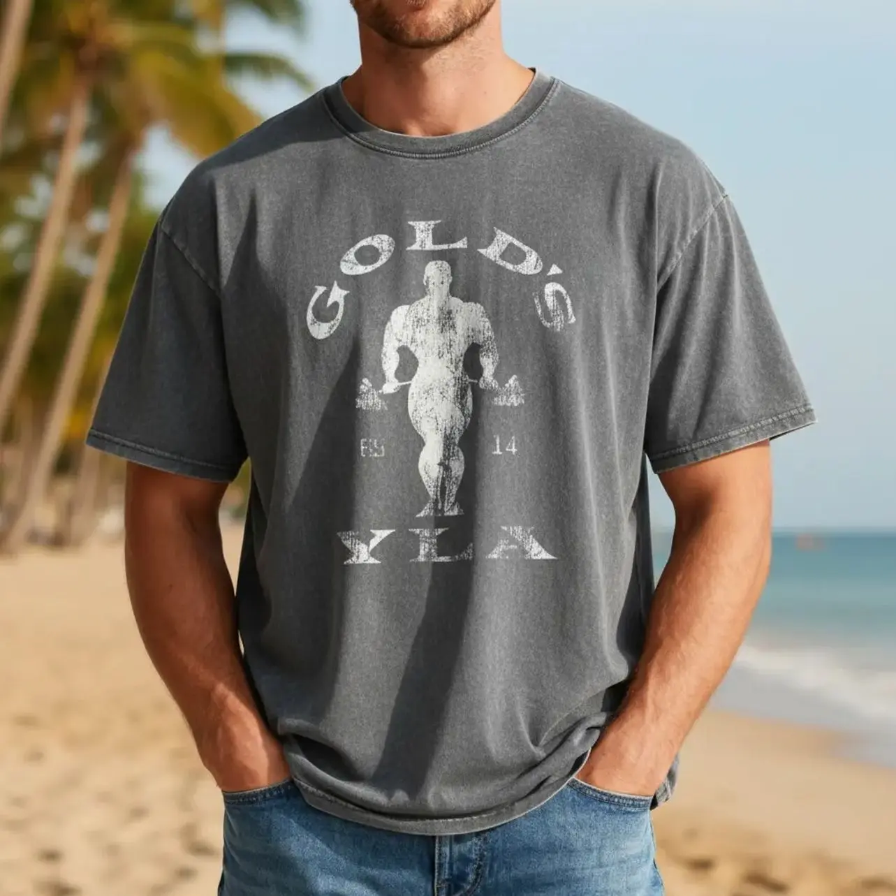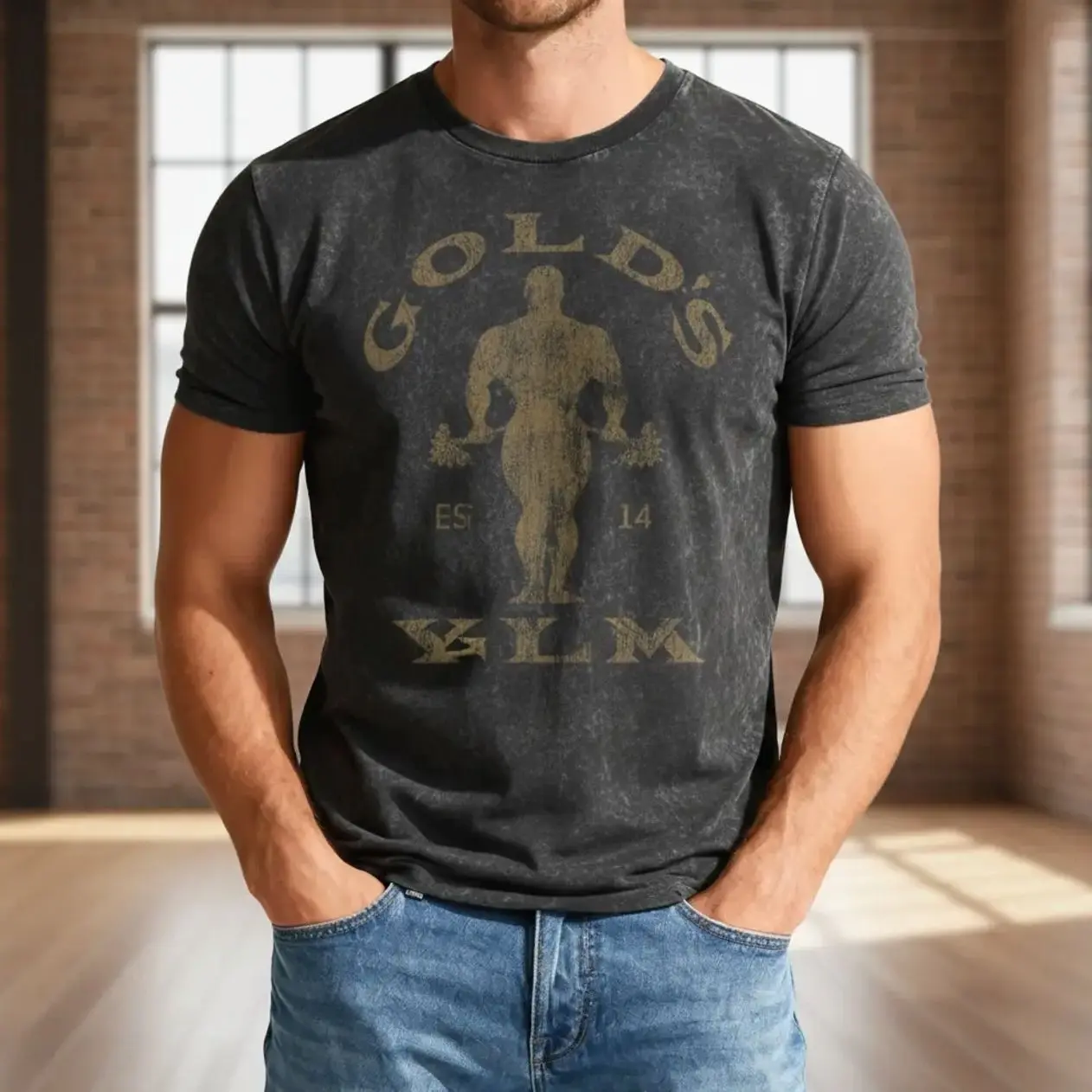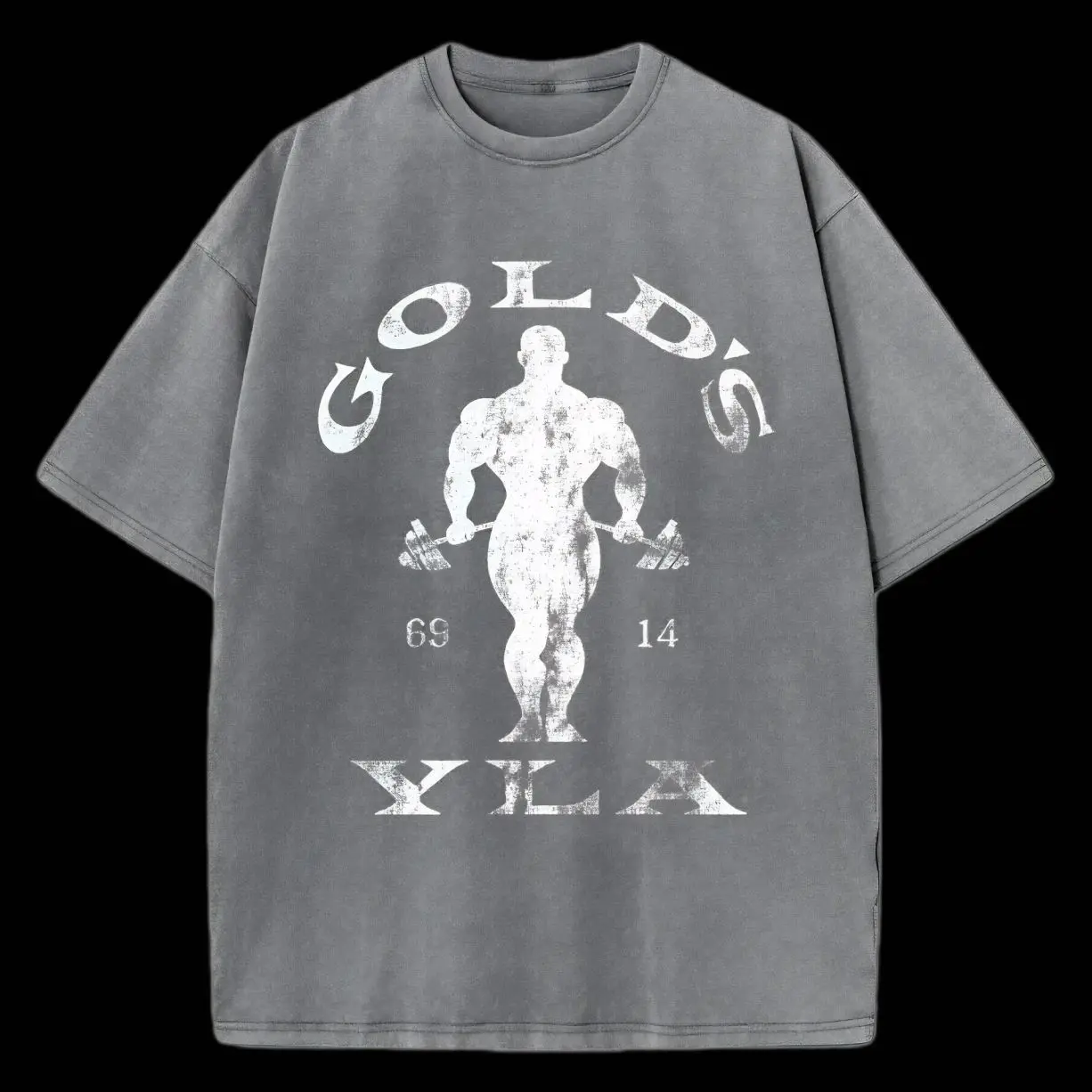 Gold's Gym Motivation Design With Golden Lettering Weightlifting Washed Round Neck T-Shirt 230gsm All Season Fitness Training Gear Sporty Vintage Crewneck 2GM