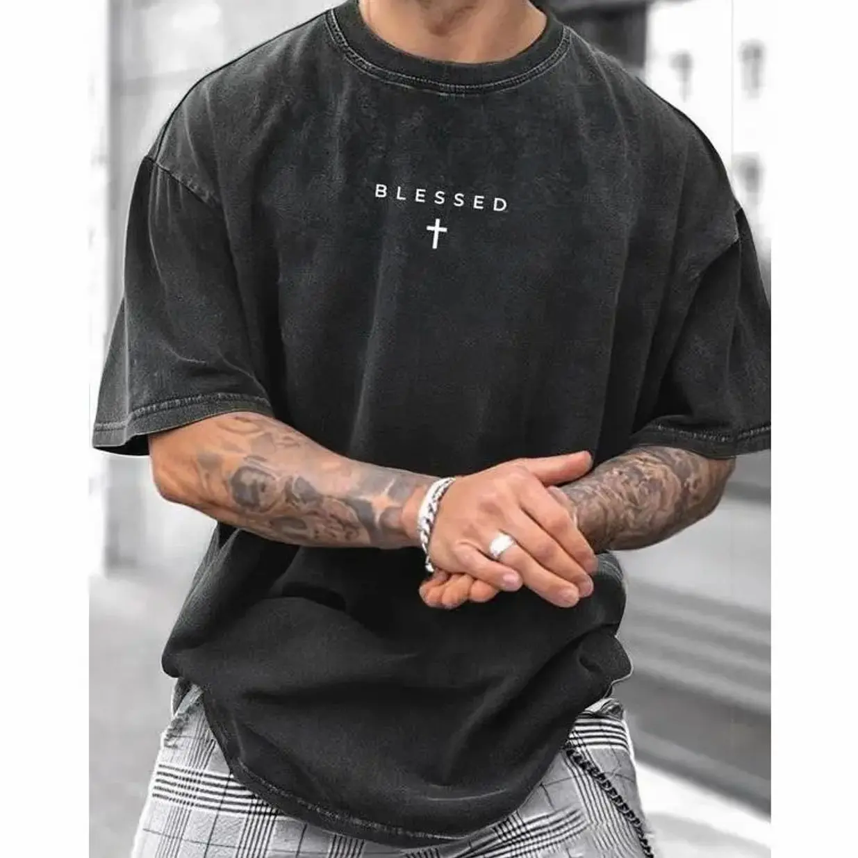 Men's Cross & Letter Print Round Neck Tee, Breathable Casual Street Short Sleeve Retro Washed T-shirt for Summer, Men's Top for Daily Wear UR8