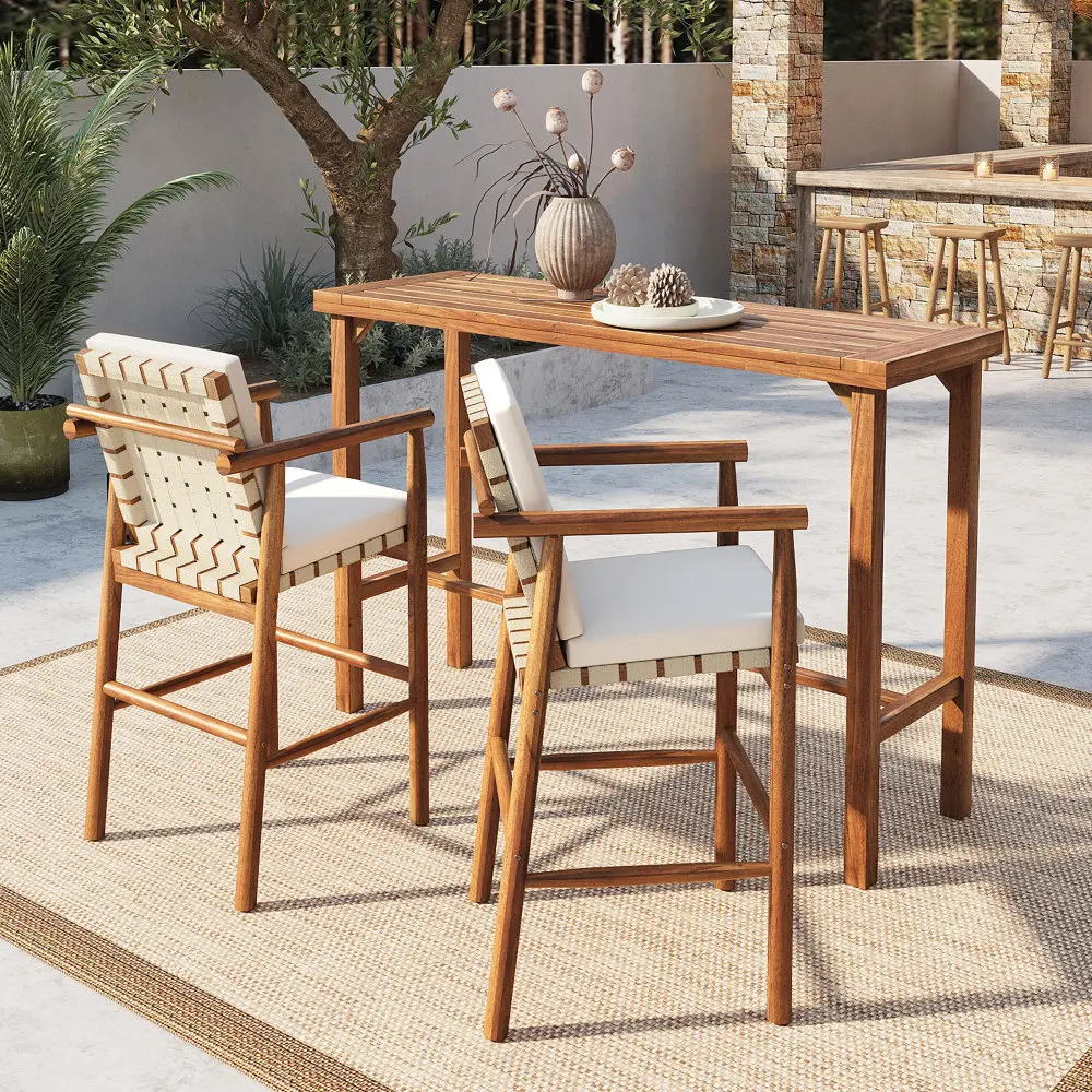 This 3-piece outdoor bar set is perfect for any space. It includes 1 table and 2 chairs, designed for patios, balconies, or gardens. The set offers elegance and functionality, ideal for gatherings or quiet evenings. The acacia wood construction ensures durability and crack resistance. Each chair supports up to 400 lbs, and the table holds 200 lbs. Enjoy comfort and style in your outdoor living area.