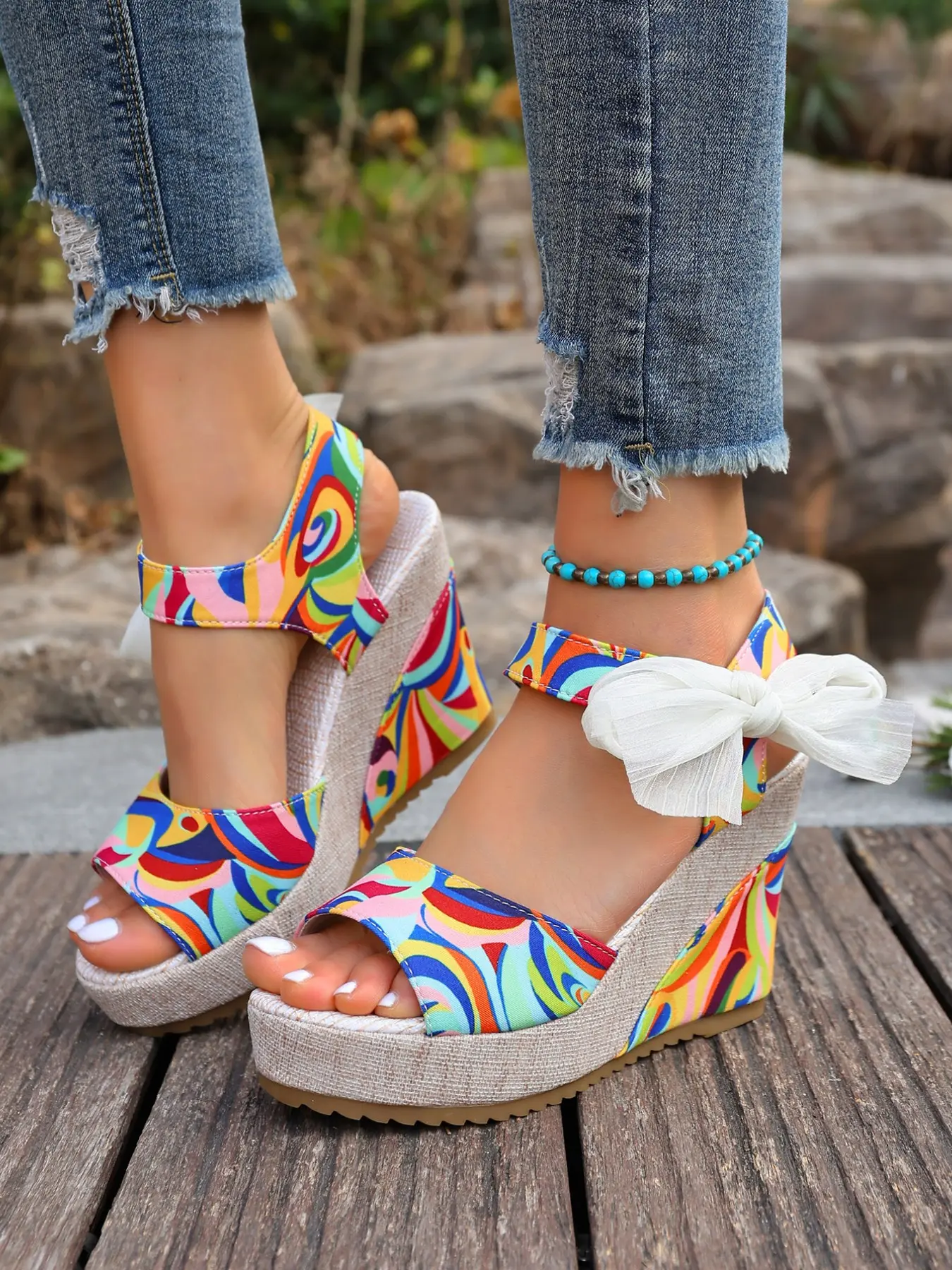 Women's Boho Abstract Colorblock Graffiti Print Shoes, Rhinestone Bow Detail, Chunky Textured Heel, Open Back Design, Versatile & Stylish