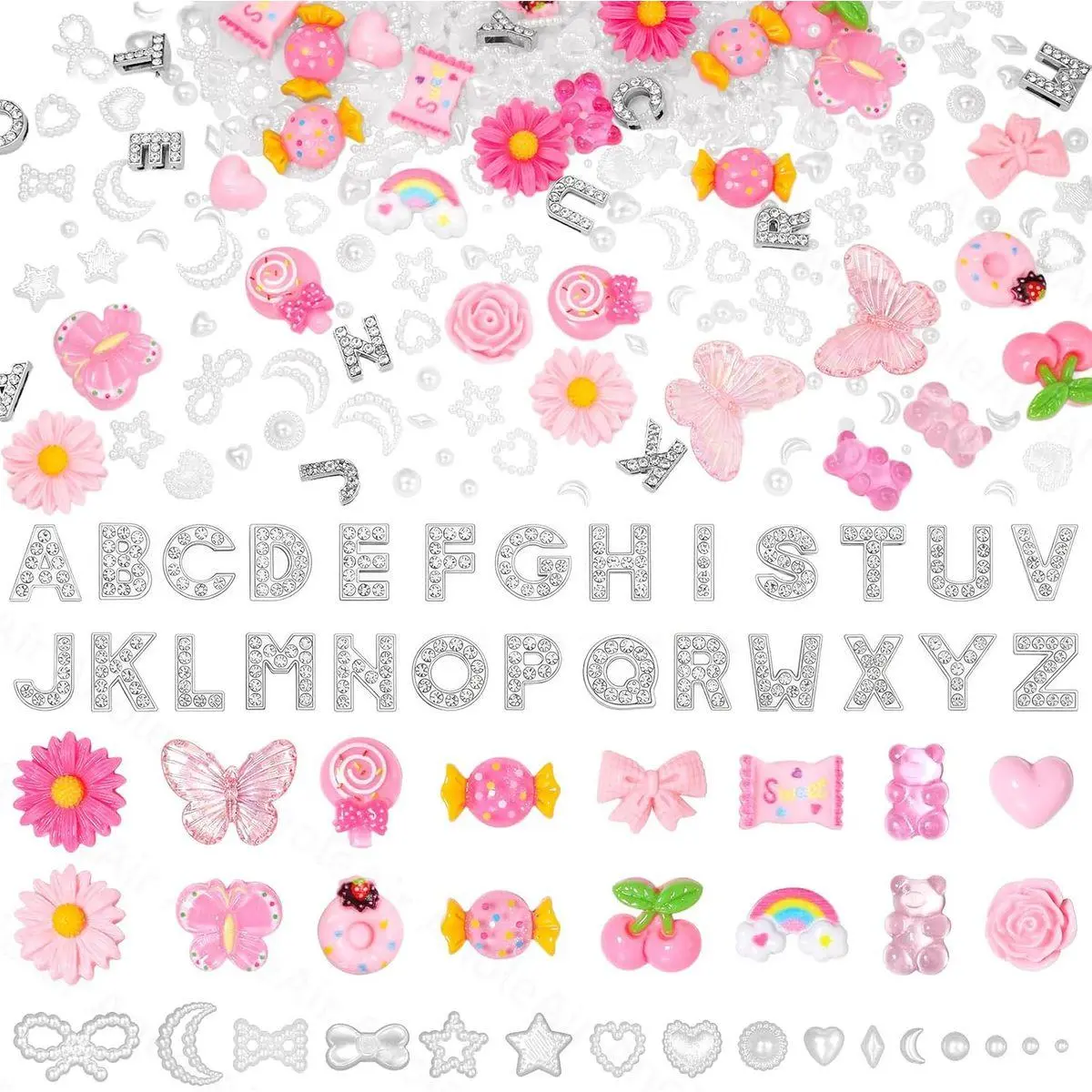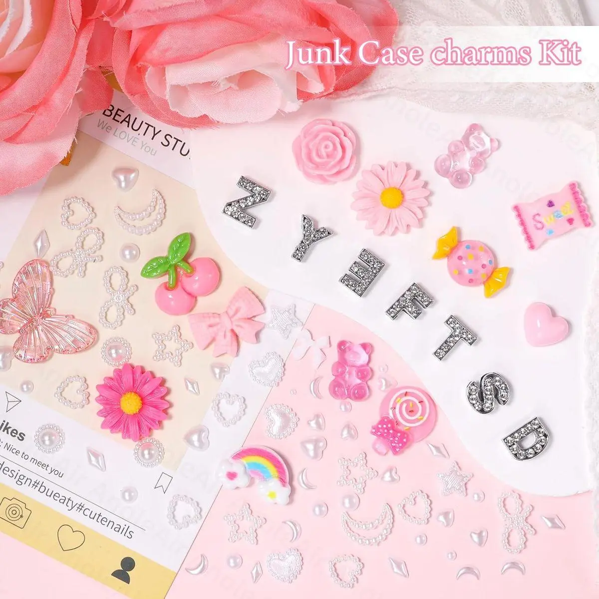 Junk Case Charms Kit: This junk case charms kit contains 26 pieces of A-Z Alphabet Letters for Junk Charms, 36 pieces of pink big cute charms for junk cases, more than 100pcs pearls heart, bow, star, moon and other gems for nails. Enough quantity meet your needs