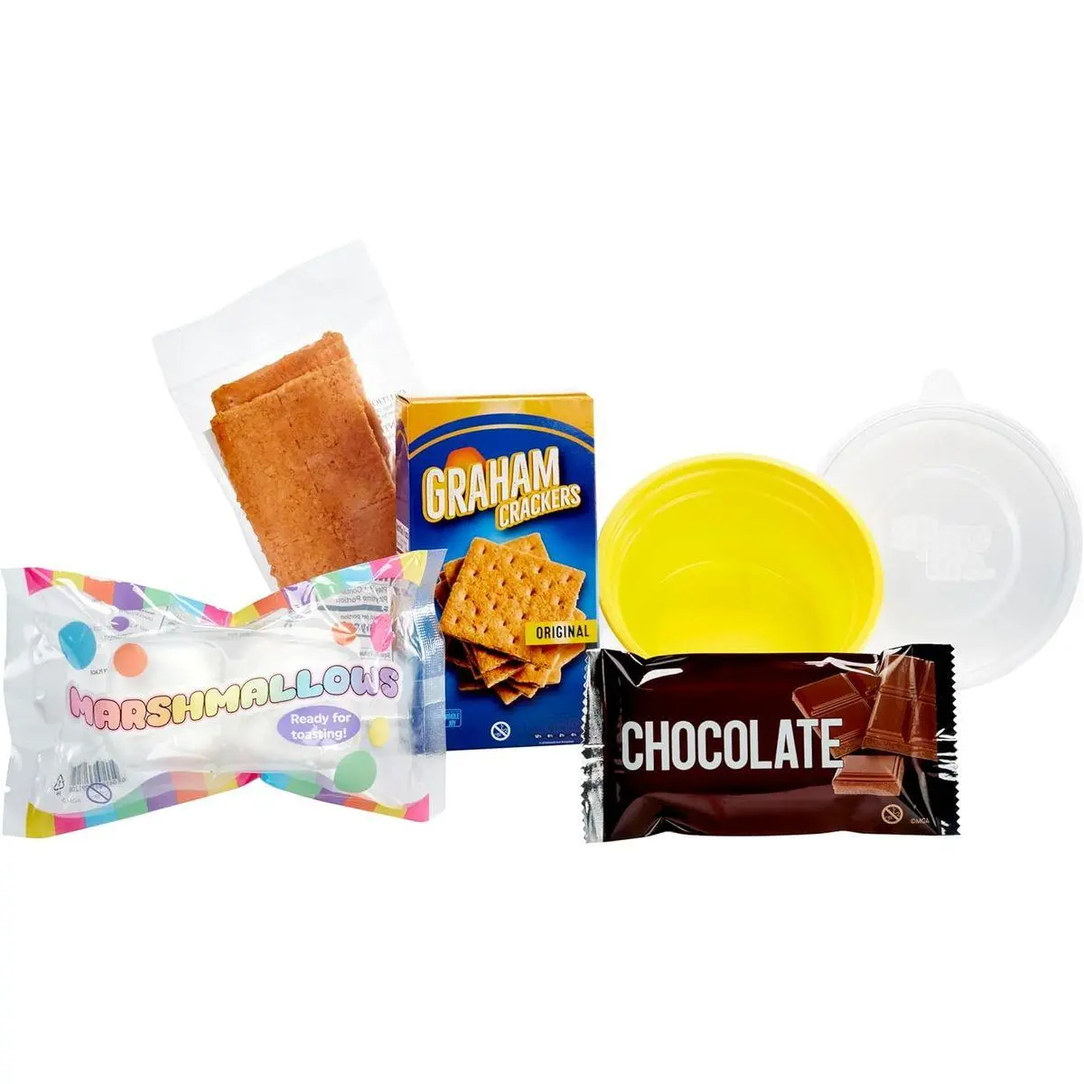 Included Ingredients: 1 Chocolate Bar (makes 2), 4 Graham Crackers, and 4 Marshmallows.