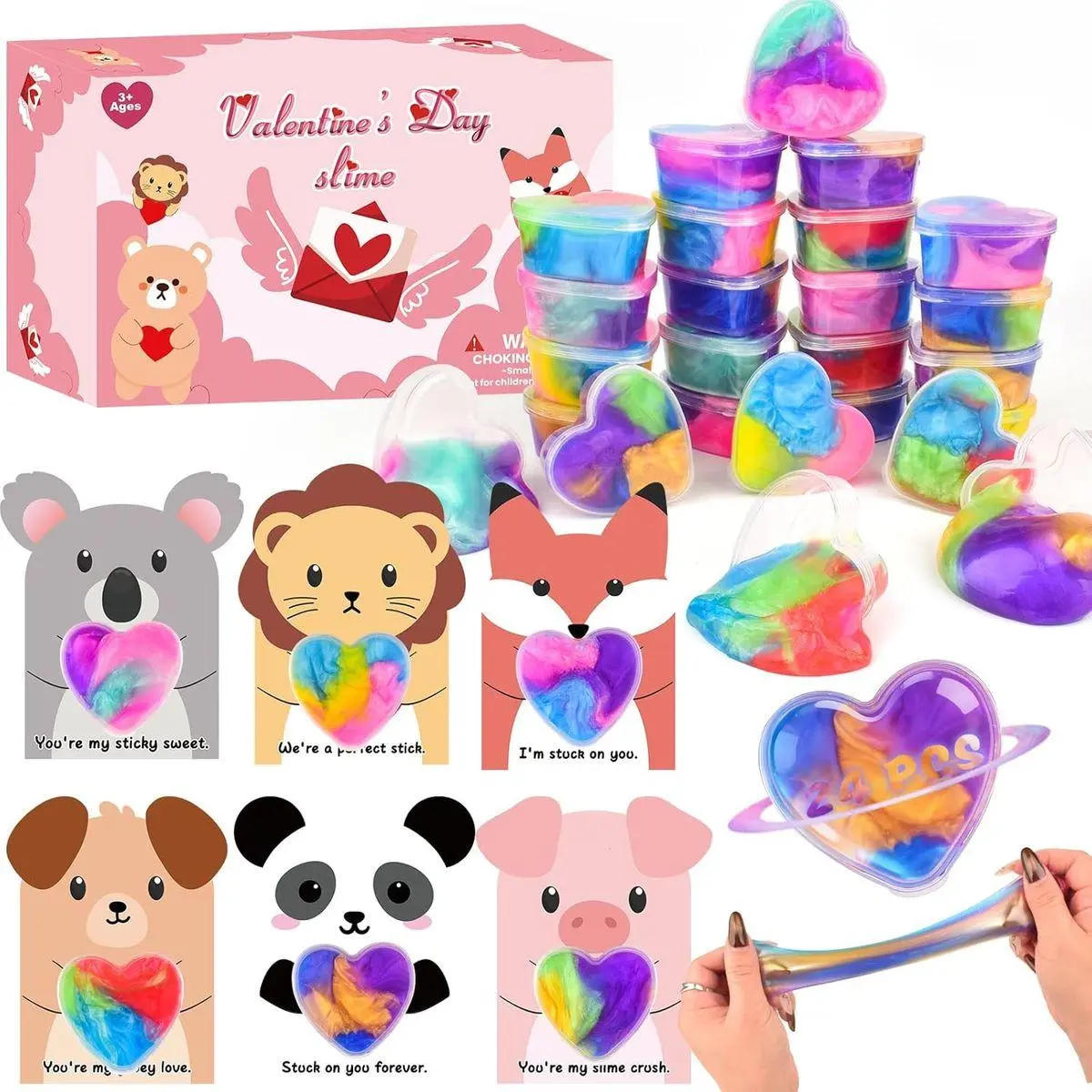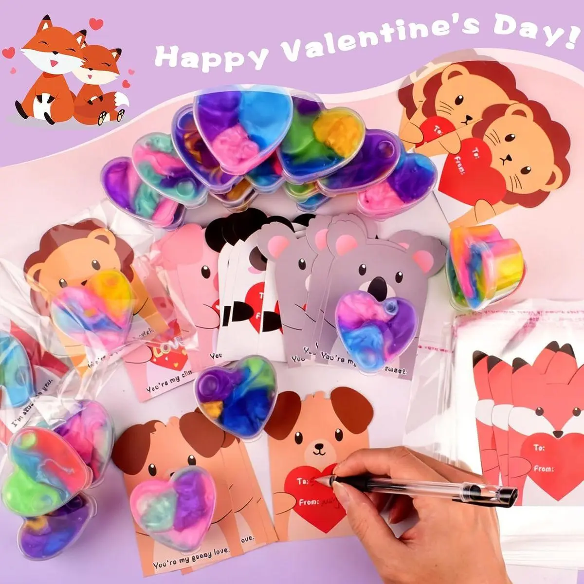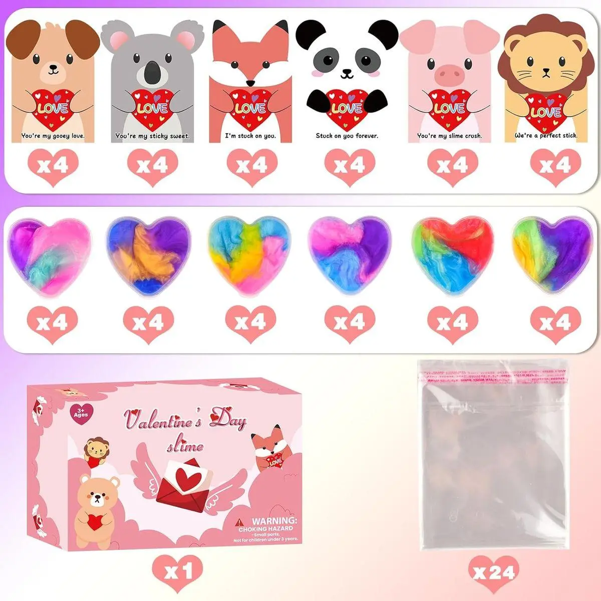 Complete 24-Pack Classroom Exchange Kit Includes 24 mini slime cups + 24 Valentine cards + 24 individual gift bags—easy to hand out for classroom exchanges, party favors, prize boxes, and goodie bags