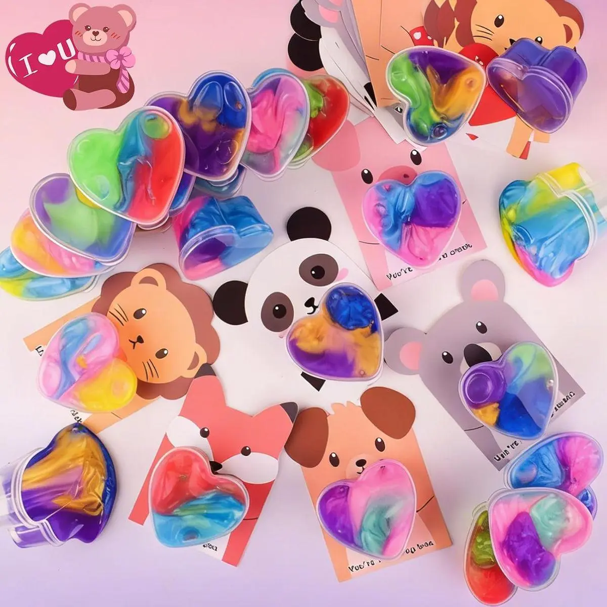 Easy to Use: This slime Valentines school prizes is super soft, stretchy, and can be reused over and over again. It helps relieve stress every time they stretch or squeeze it and it also adds some fun surprises this Valentine's Day by boosting their hand reflexes and creativity while they knead, spin, or bounce it around,Each cup is re-sealable for simple storage. Close the lid after play to help keep the slime soft and ready for next time