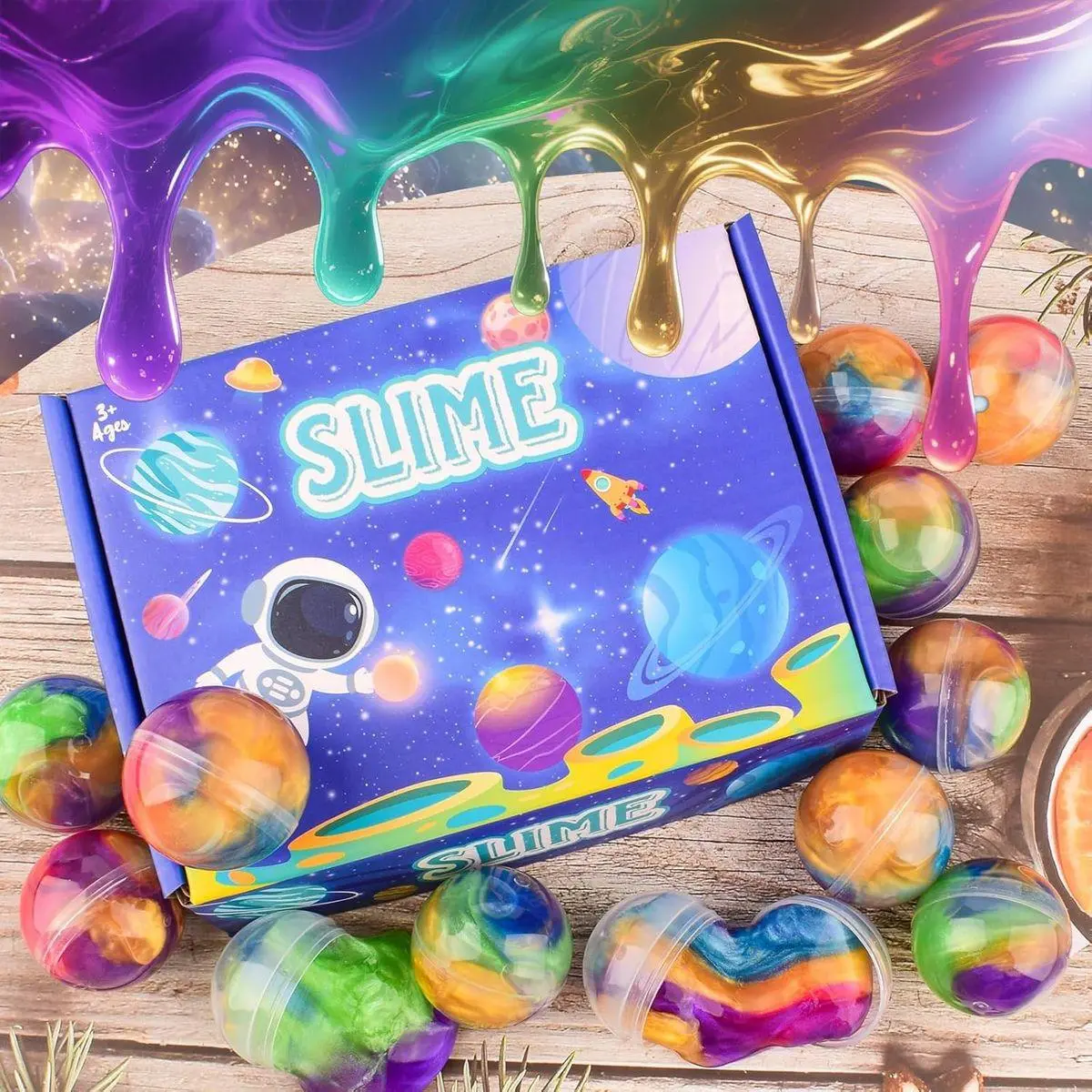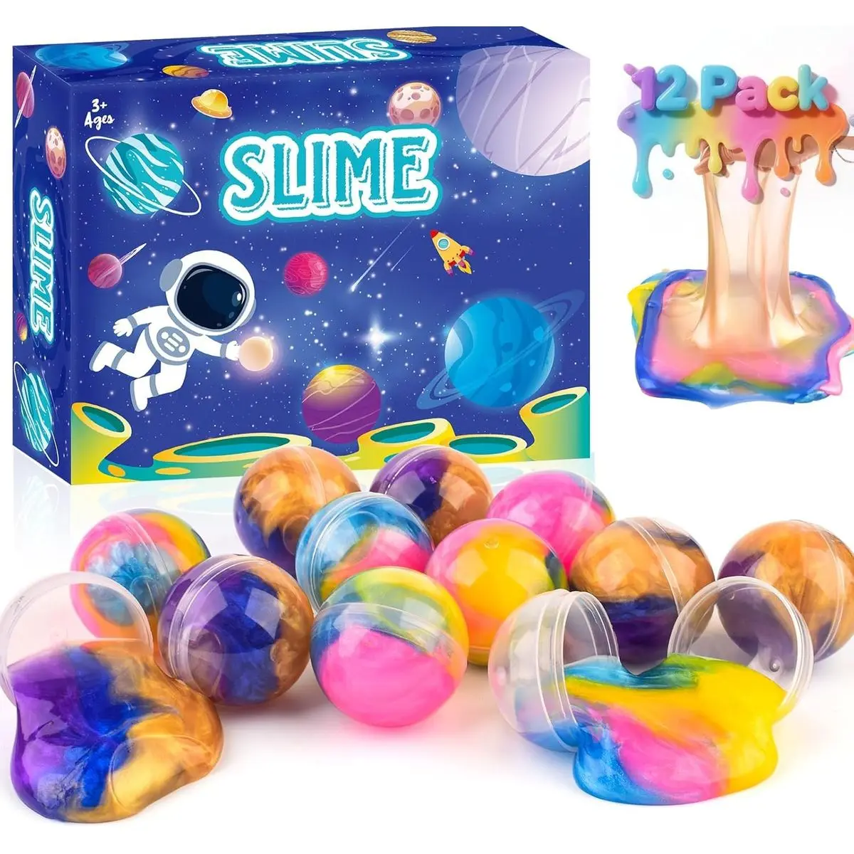 12 Colorful Slime Balls – Includes 12 mini galaxy slime balls in vibrant rainbow colors, each sealed in a 3.8cm clear sphere for fun and easy storage.