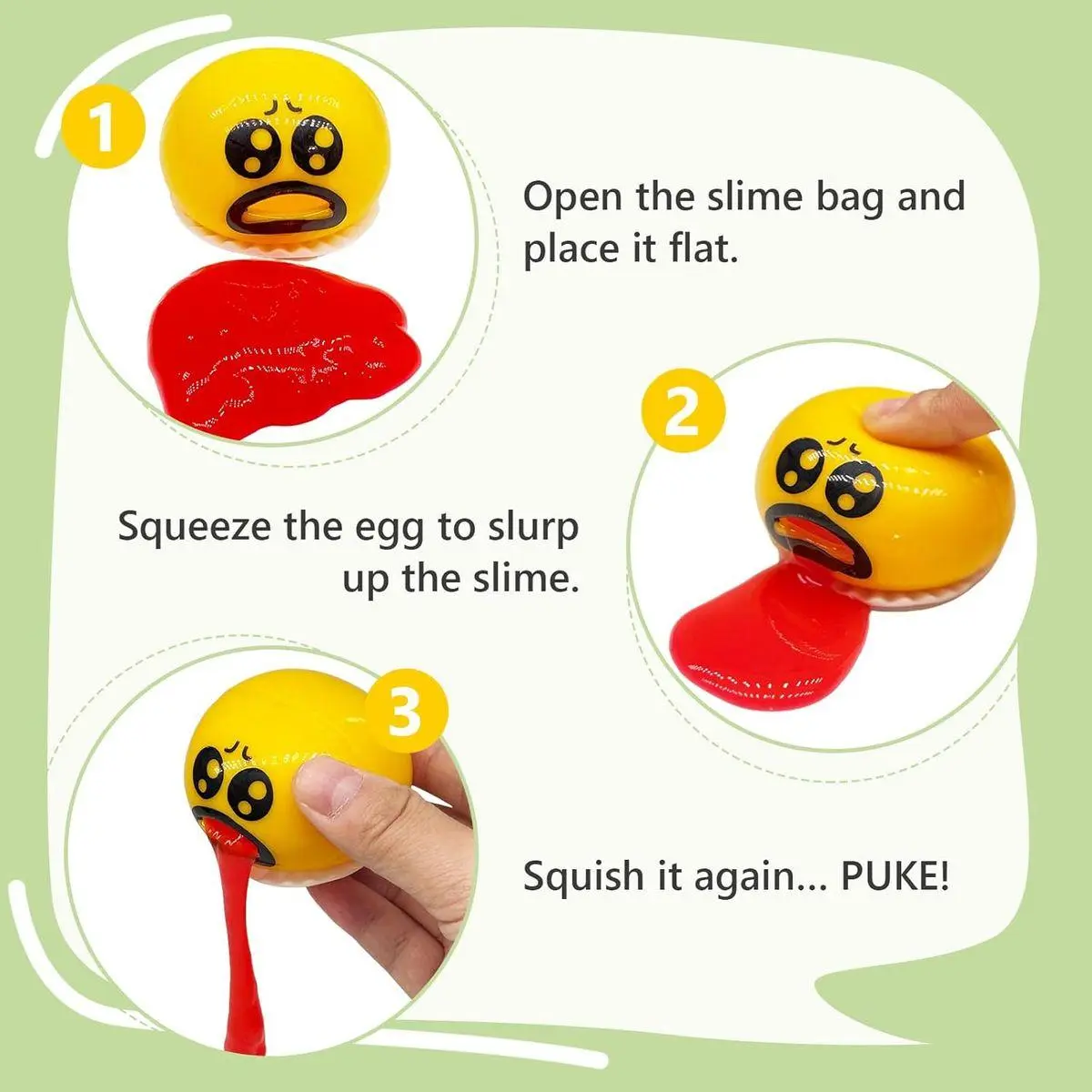 Package Includes – 4 puking egg stress balls with funny faces and 8 colorful slime packs, providing more fun and longer playtime to share with friends and family.