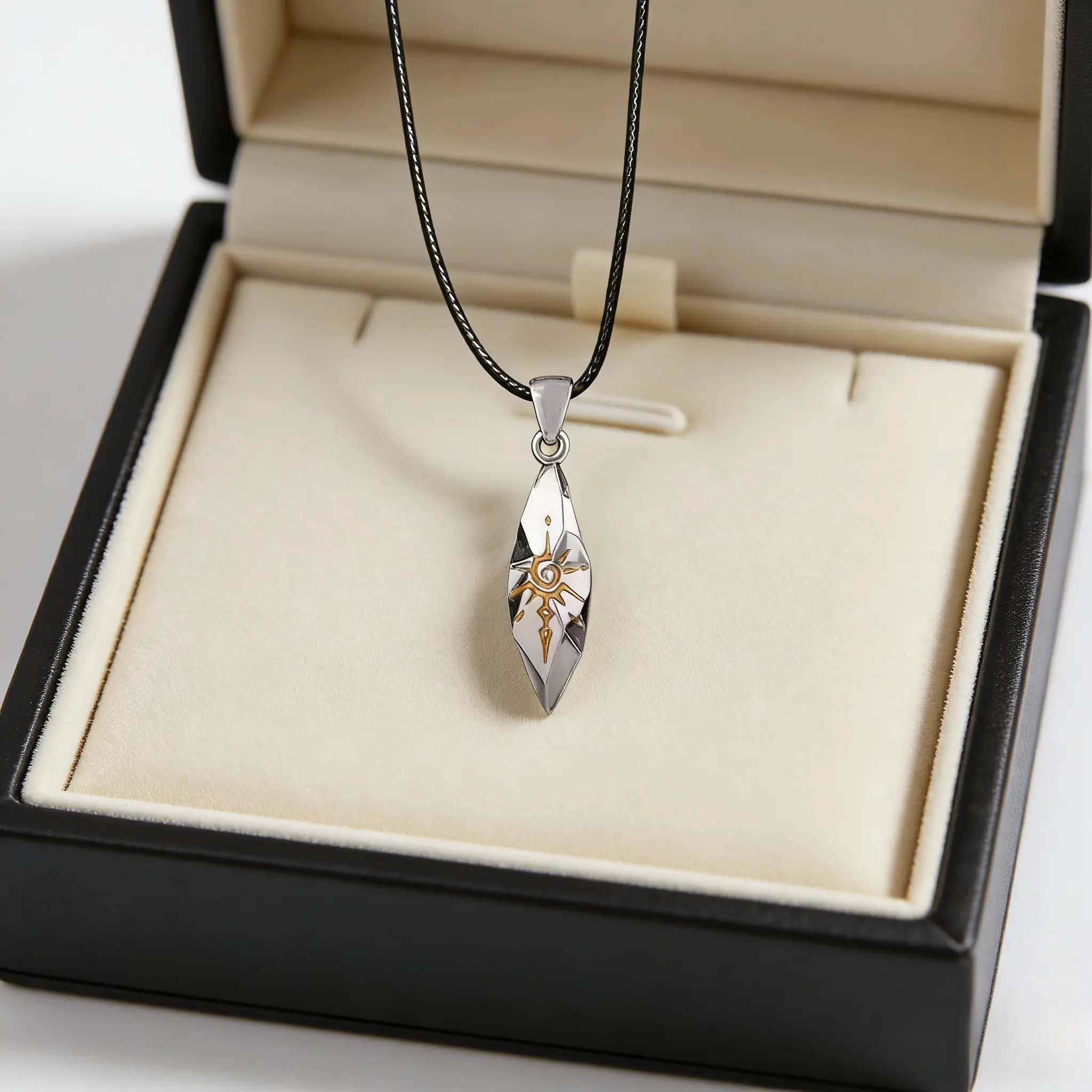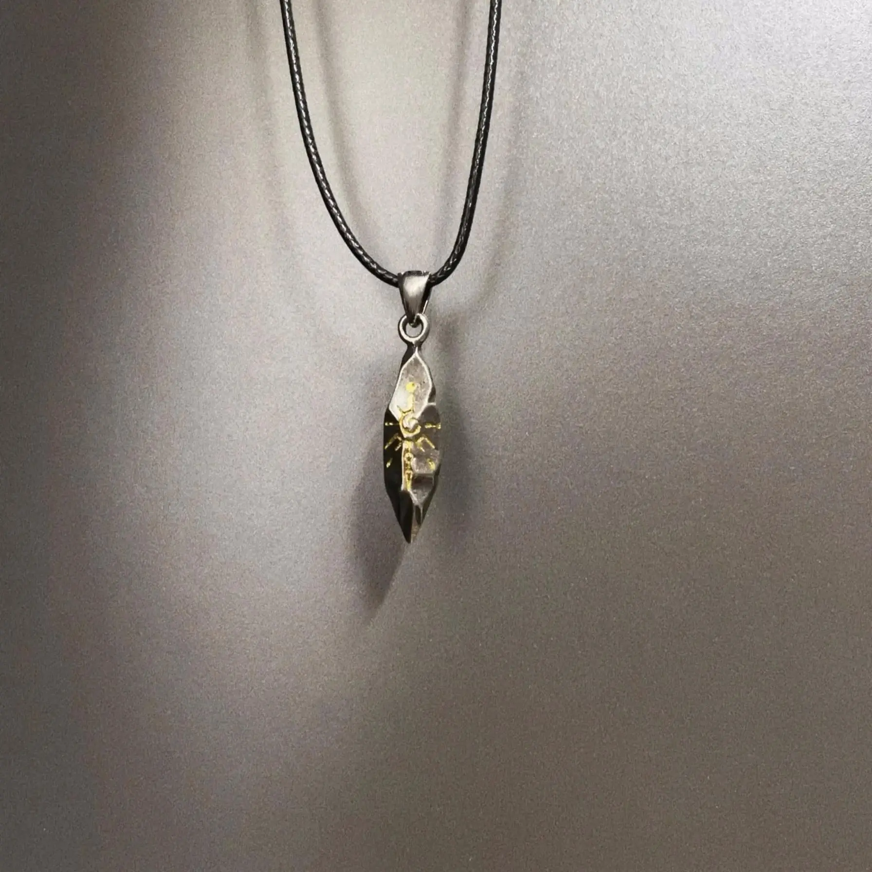 The pendant features a textured, meteorite-inspired shape with hand-painted golden rune details, evoking a sense of mystery and ancient luck.Paired with a sleek black leather cord, this neutral design works seamlessly for both men and women, perfect for layering as a sweater chain or wearing solo for a bold, minimalist look.