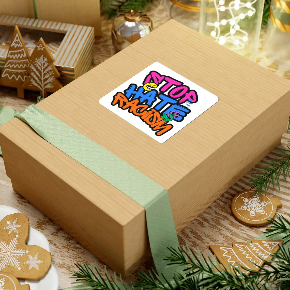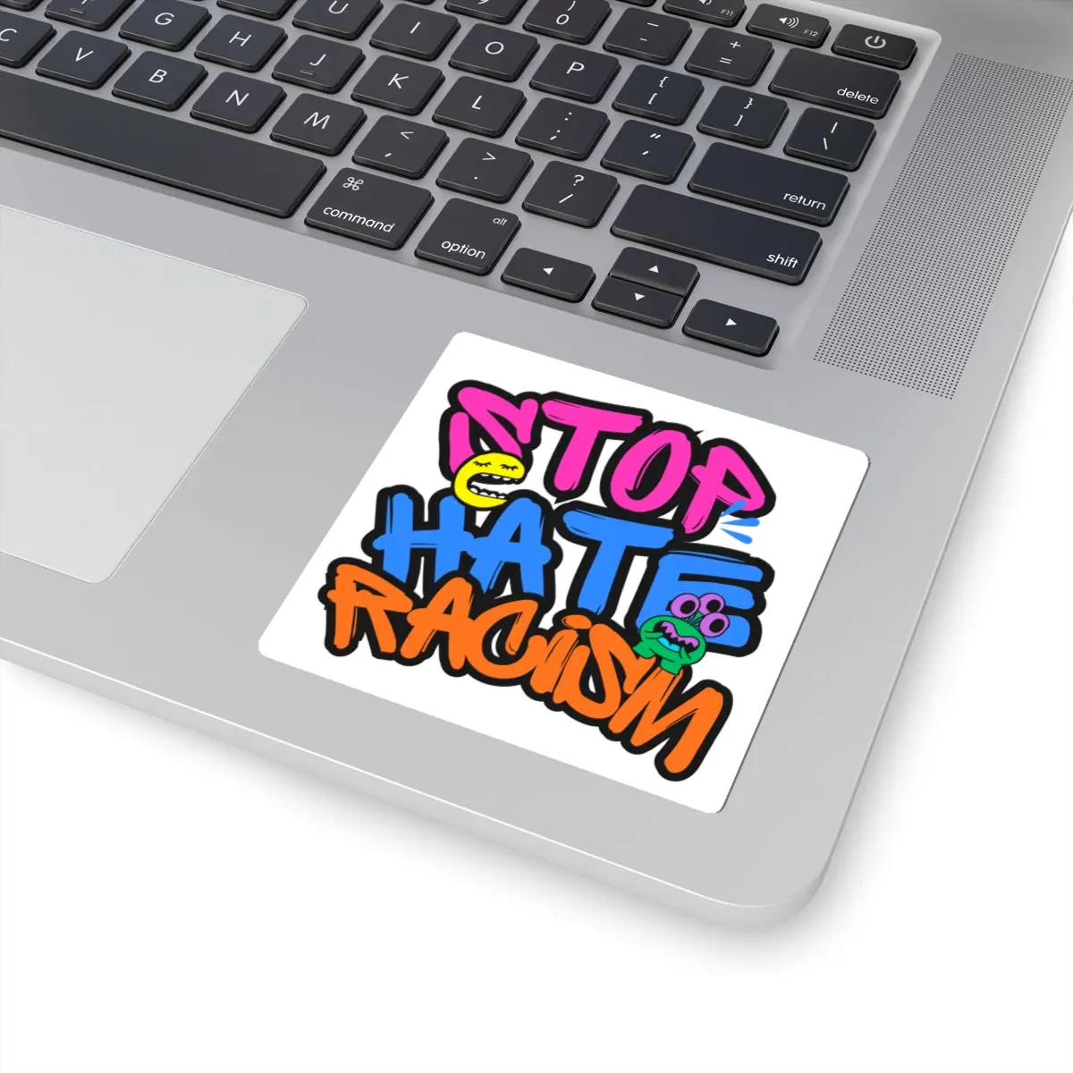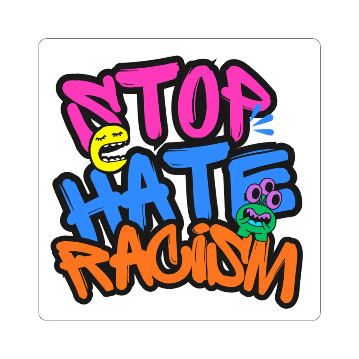 Bright, bold, and unapologetic—this kiss-cut sticker turns a laptop, journal, or water-resistant surface into a statement. Colorful graffiti-style lettering shouts “Stop Hate Racism” while playful character accents keep the mood defiant yet hopeful. The glossy finish makes colors pop and resists light scratching, so your message stays vivid through daily wear. Easy to apply without bubbles, available in white or transparent backgrounds and multiple sizes to suit gear or décor. Hang it where it’ll be seen and let a small, vibrant decal carry a big message.