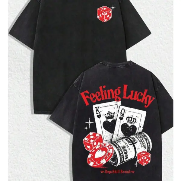 1 PCS Retro "Feeling Lucky - Casino Elements" Graphic Tee: Featuring Distressed Vintage Finish, Front Mini Red Dice Print, Back Bold "Feeling Lucky" Letter Print In Red, Artistic Illustration Of King & Queen Poker Cards, Dice, Casino Chips, And Rolled Do