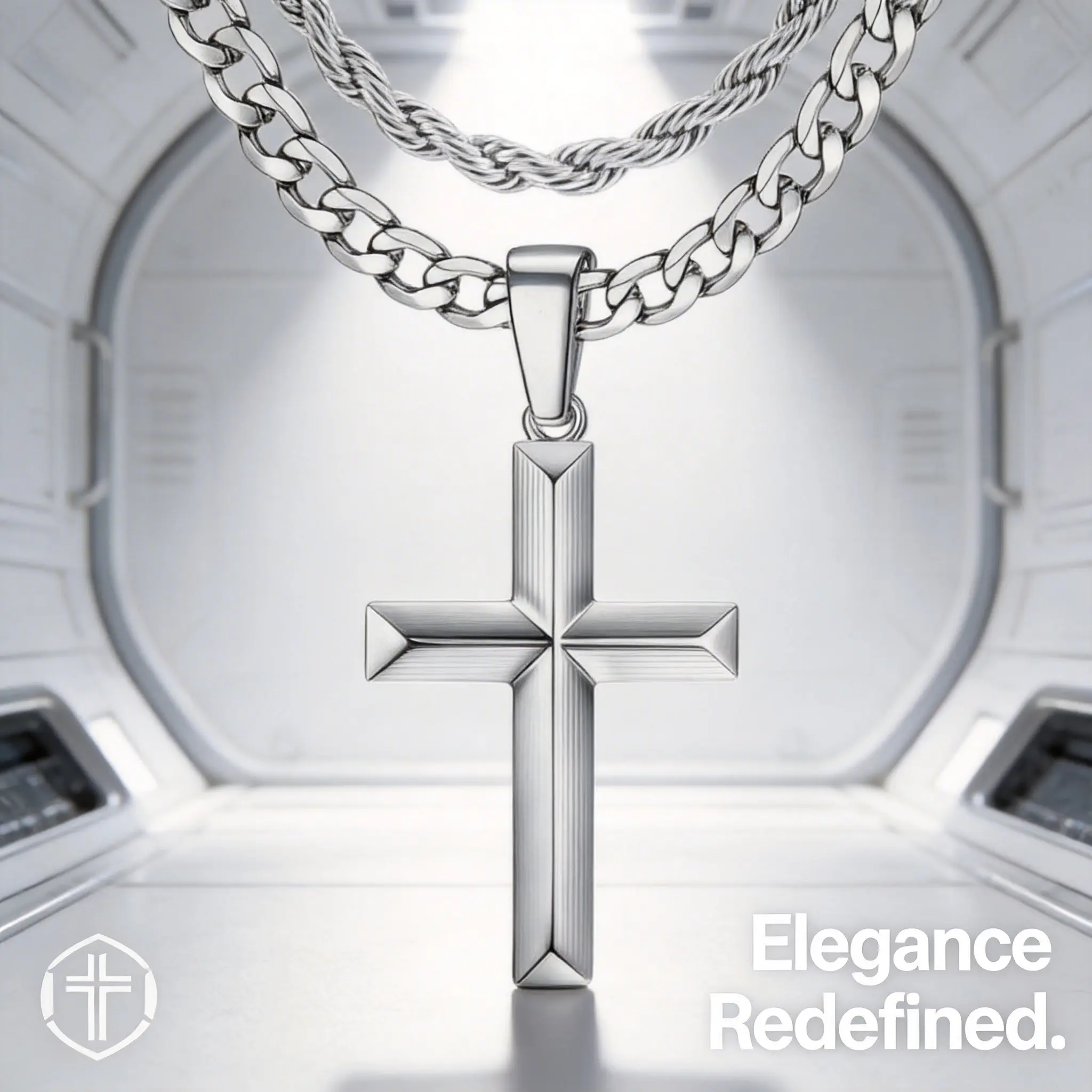 Pendant Design: Polished faceted cross pendant, sleek modern silhouette with light-catching facets