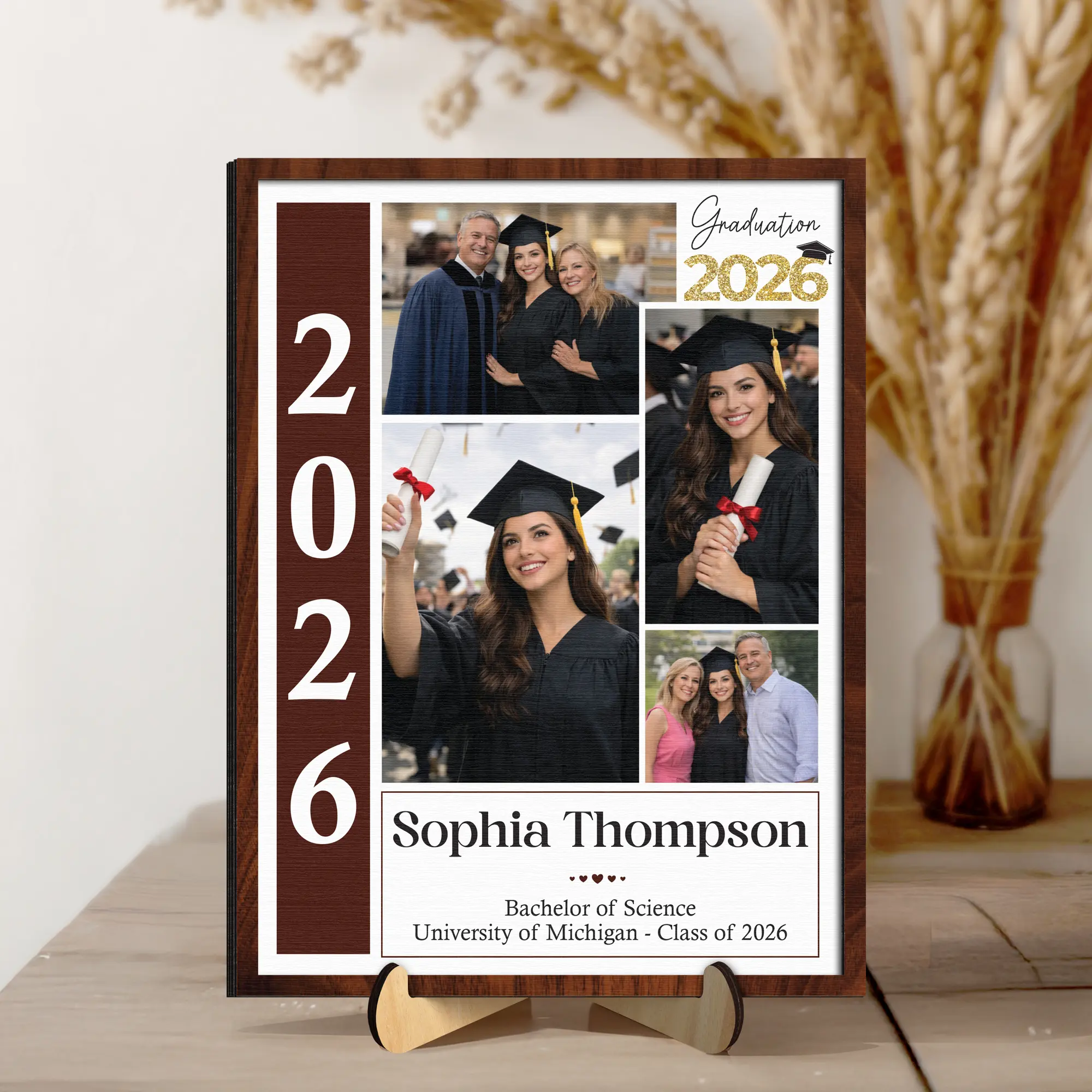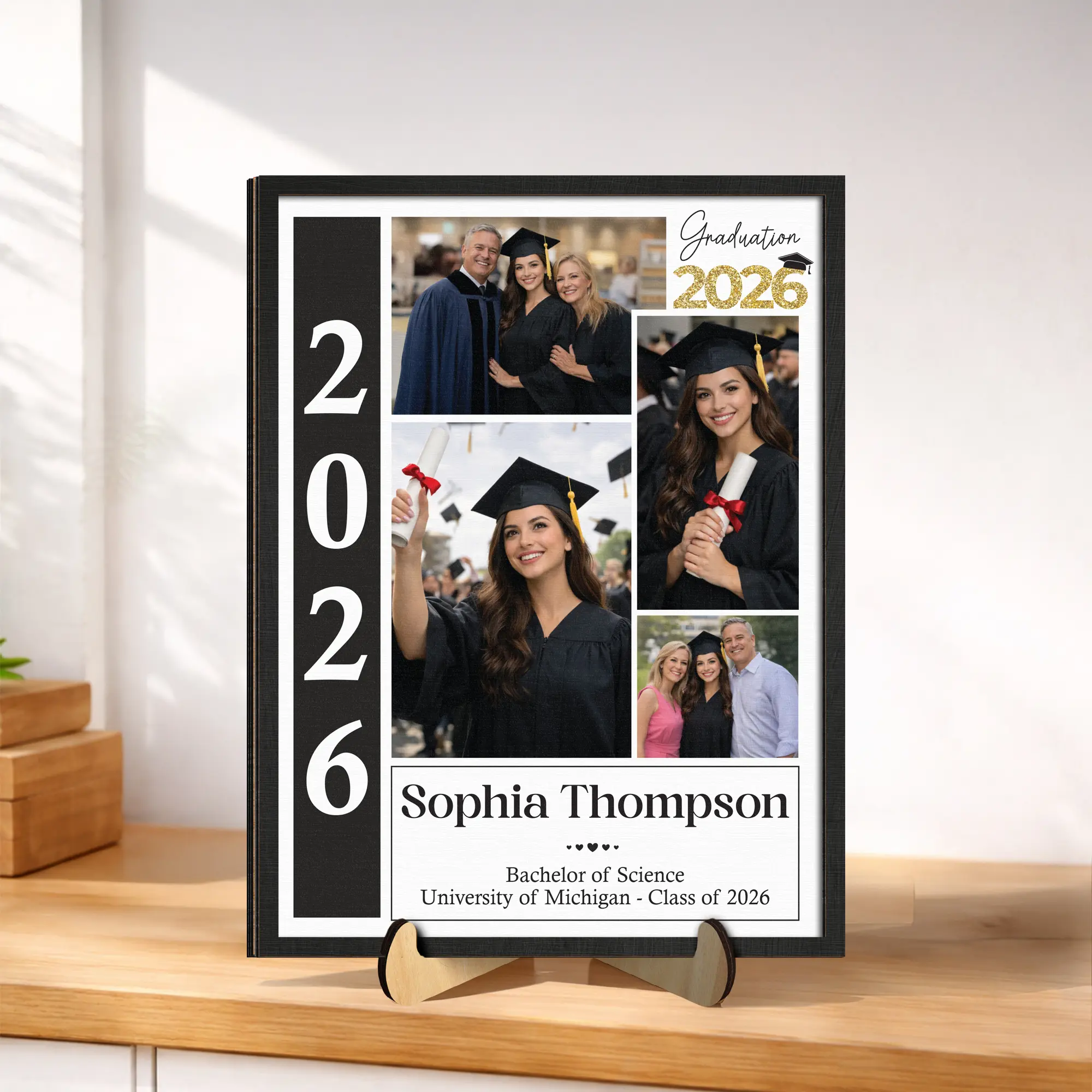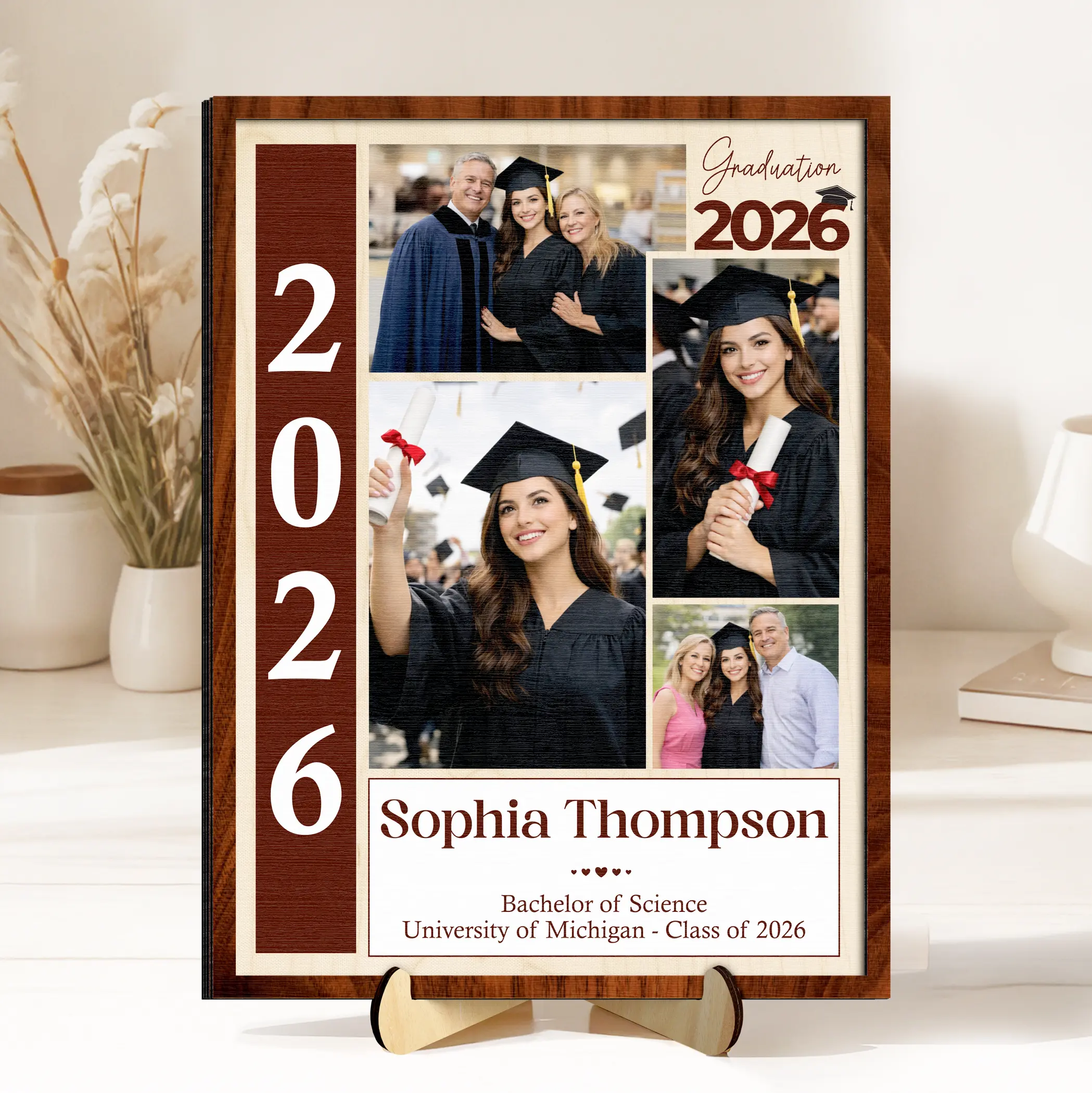 Preserve the joy of graduation day with this multi-photo keepsake. It honors your daughter's specific degree and university accomplishments. Create a professional and sentimental display for graduation parties or home mantels. Feature photos of the graduate with family and loved ones. It's a great gift for university and college graduates.