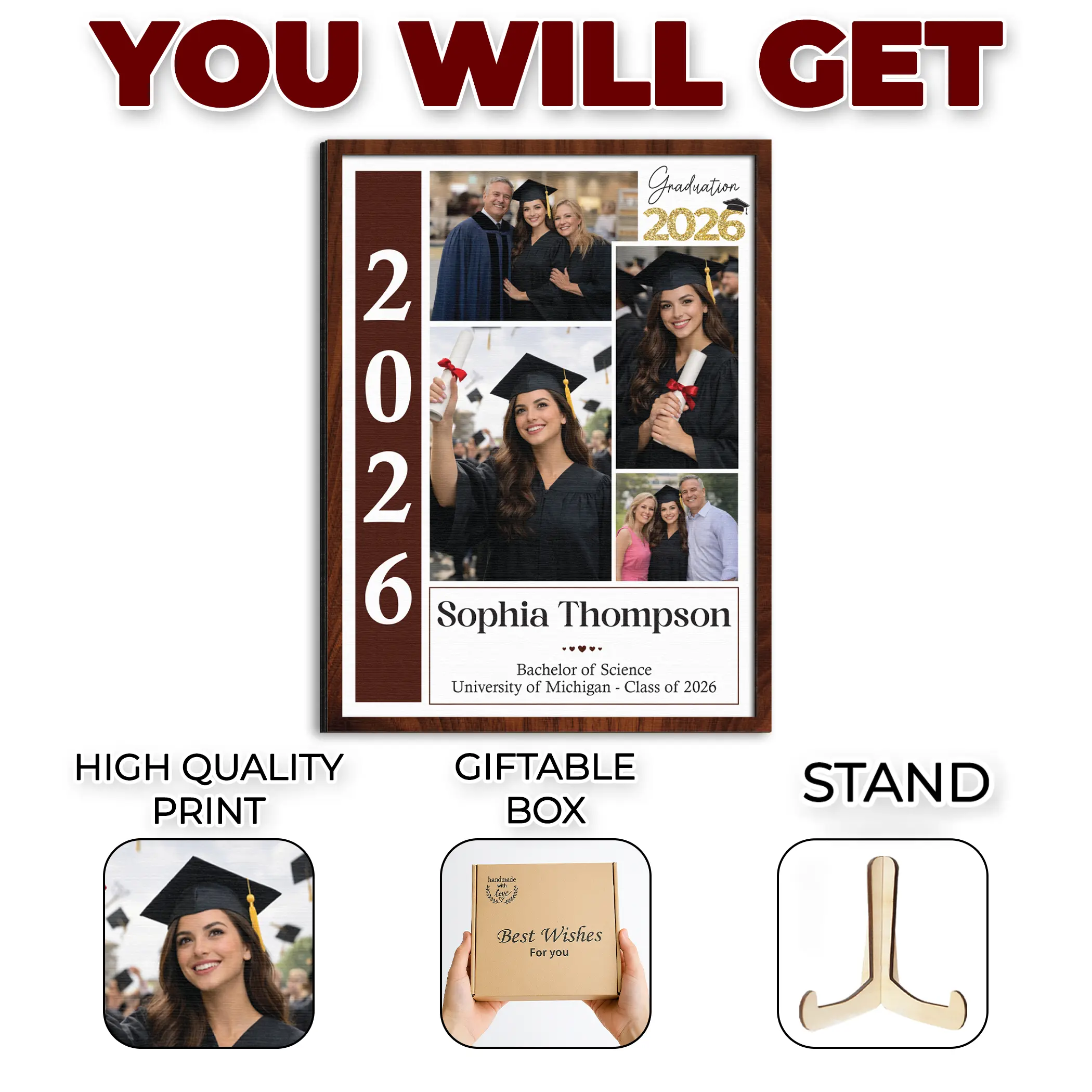 Celebrate your graduate's achievements with this Custom Graduation Photo Frame. It's a perfect keepsake for the Class of 2026. Display a Graduate University With Family portrait in this wooden sign. It's a timeless gift for your daughter. The frame includes a wooden stand and a giftable box. Material: Wood. Sizes: 6", 8", 10", 12".
