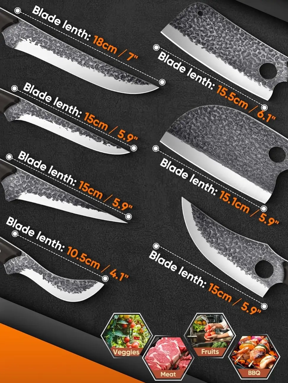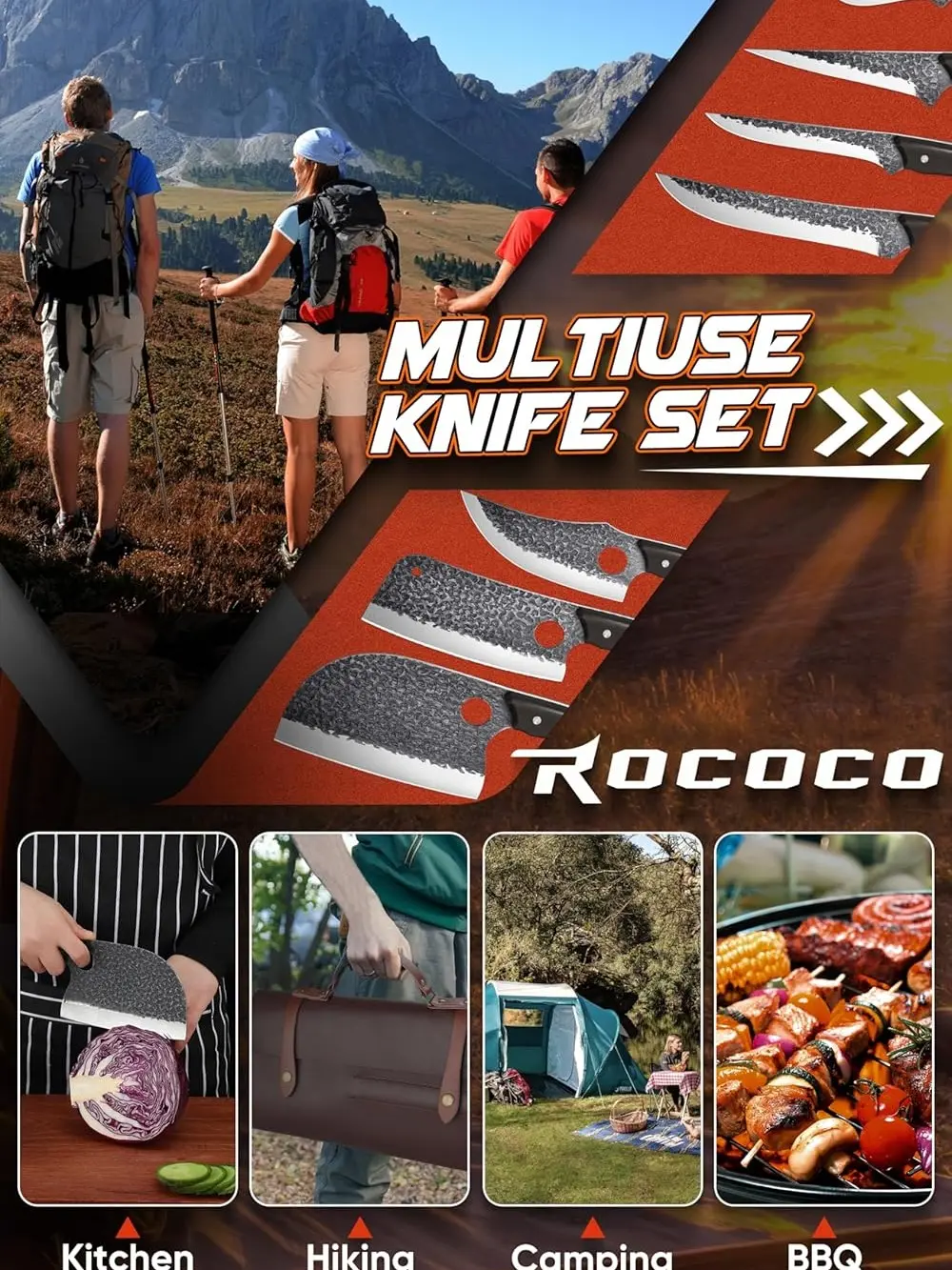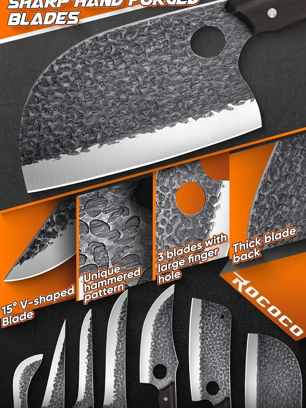 ·MULTIUSE MEAT CLEAVER SET - The multipurpose Serbian chef Viking cleaver set is suitable for cutting vegetables, meat, fruits, filleting fish, deboning meat, chopping soft bones and so on. Equipped with a portable rolled leather sheath, it’s easy to carry around when you are having a BBQ, camping, hiking and doing other outdoor activities. Undoubtedly, it's a fantastic addition to your collection and will be a special gift for your family and friends on Birthday, Thanksgiving Day, Christmas Day and others.