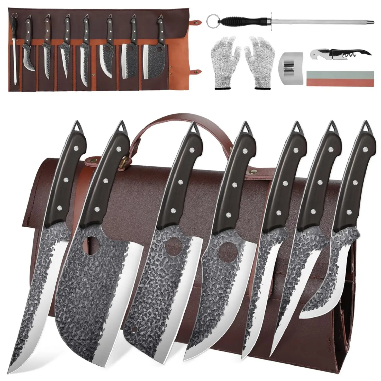 ·13 IN 1 BUTCHER KNIFE SET - The ROCOCO butcher cleaver Set contains 7 knives, 5 accessories and a rolled leather bag. Knives are a Serbian Chef Knife, a Chinese Cleaver knife, a viking knife, 3 boning knives and a peeling knife. Knife accessories include a Sharpening Rod, a Whetstone, a Finger Guard, a pair of woolen gloves, and even a bottle opener. The portable rolled leather bag can store 7 knife and the Sharpening Rod well.