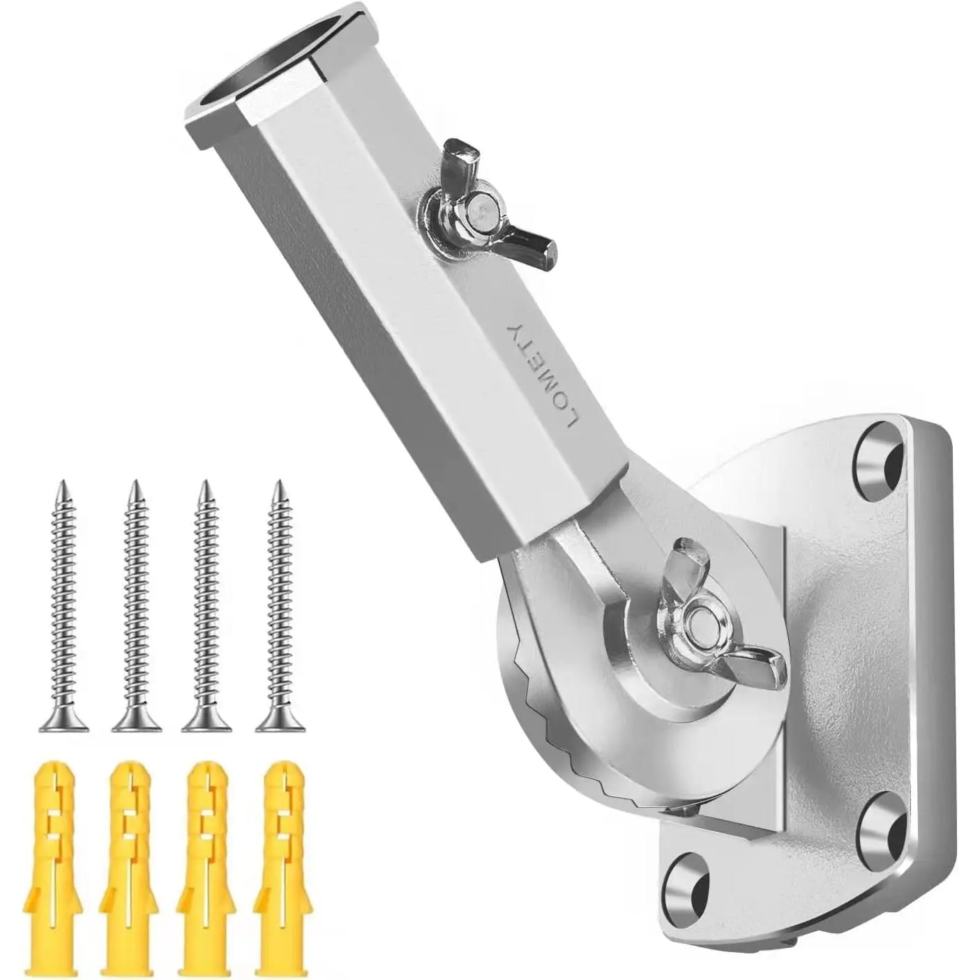 Heavy duty and durable: This flag pole holder is made of high-strength 304 stainless steel, which can resist hurricanes above level 12. this flag pole bracket is recommended to be used in hurricane areas.This flag bracket also has the characteristics of anti-rust, waterproof and anti-corrosion.This flag holder is incomparable to aluminum products and plastic products.It can be used for at least 10 years.Professional: LOMETY is a factory specializing in the production of stainless steel flagpole holders.Each product is designed and produced by itself, and the models are unique.Multi-angle adjustment: This flag pole holder is suitable for standard 1-inch flagpoles.It adopts gear bite and has 12 adjustment angles.Easy to install: The flag bracket comes with all the installation accessories, including a holder, 4 screws, 4 expansion screws, and 1 butterfly screw, you can attach it to an outside wall of your house or to a sturdy wooden post.Humanized design: This flagpole holder has a unique design, which is not only beautiful, but also has a water guide point and a water guide groove, which will not produce water accumulation.