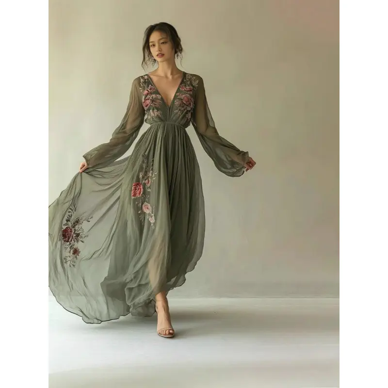 ANRABESS Womens Boho Maxi Dresses 2026 Summer V Neck Puff Sleeve Floral Flowy Swing Casual vacation Long Dress Boho Sundress Plus size Maxidresses Outdoor Womenswear