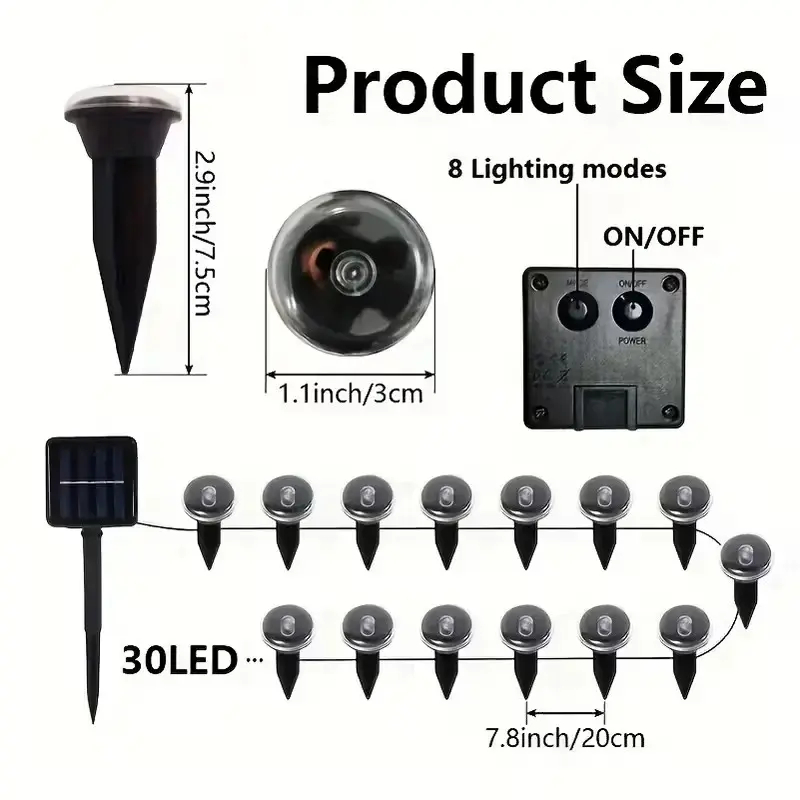 Say goodbye to messy wires and high electricity bills — let your garden shine with poetic light after dark! This floor-mounted solar-powered string light is specially designed for outdoor landscape decoration. With 30 evenly distributed high-brightness lamp heads, it combines lighting, decoration and practicality, effortlessly illuminating your courtyard, garden, path, steps and lawn, turning an ordinary outdoor space into a romantic and elegant retreat for evening relaxation. It adds unique charm to your yard for both daily leisure and festive celebrations.