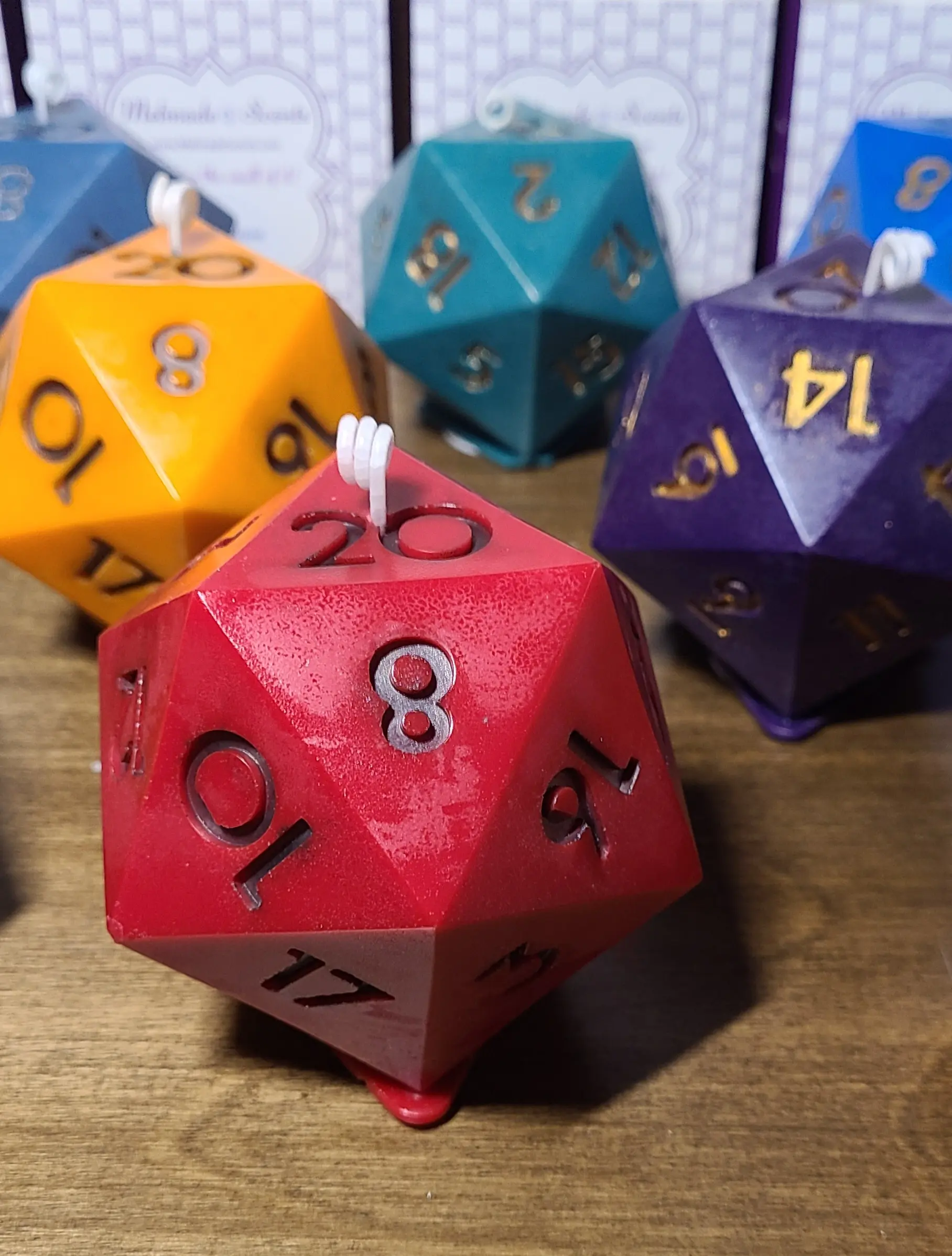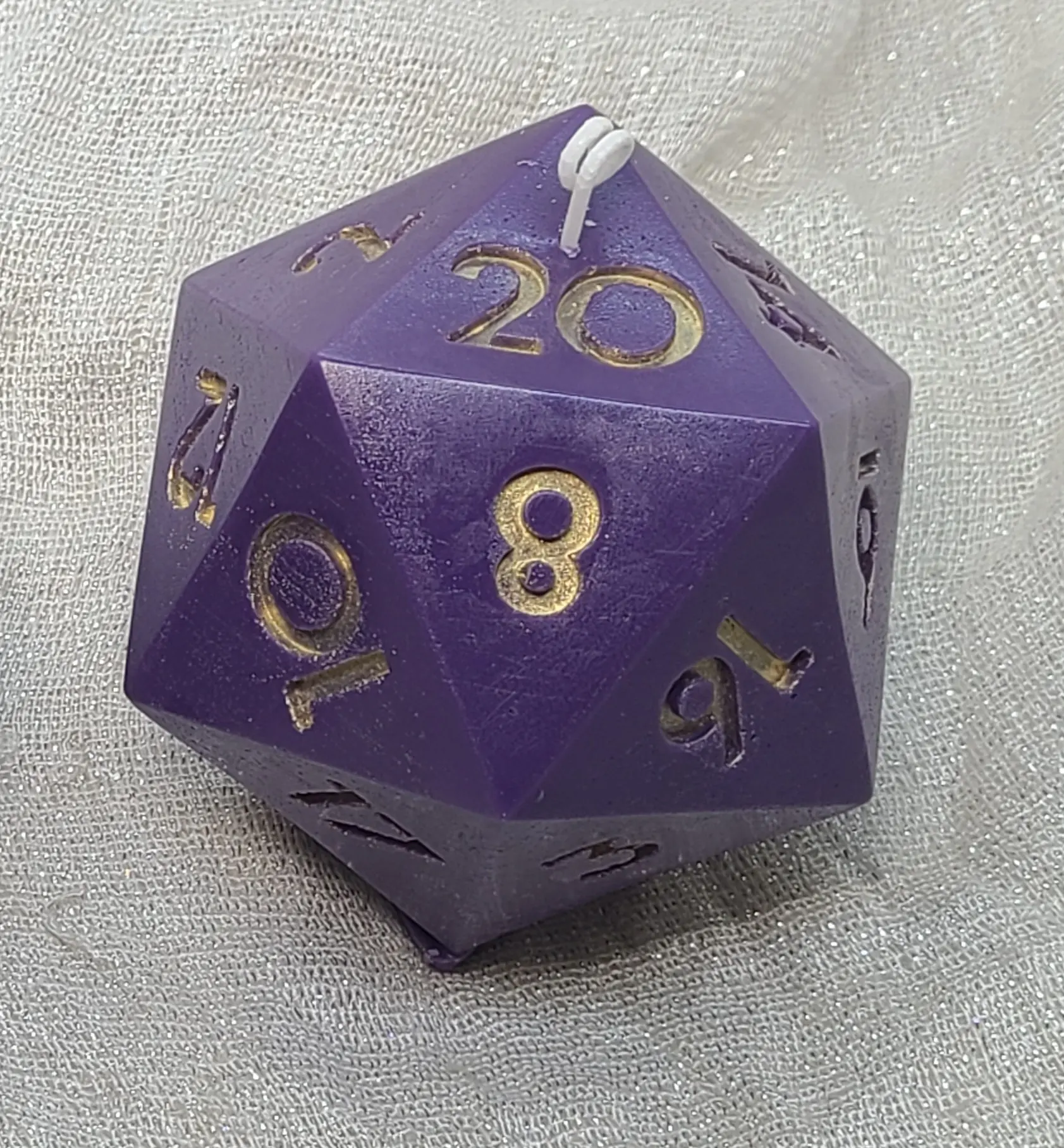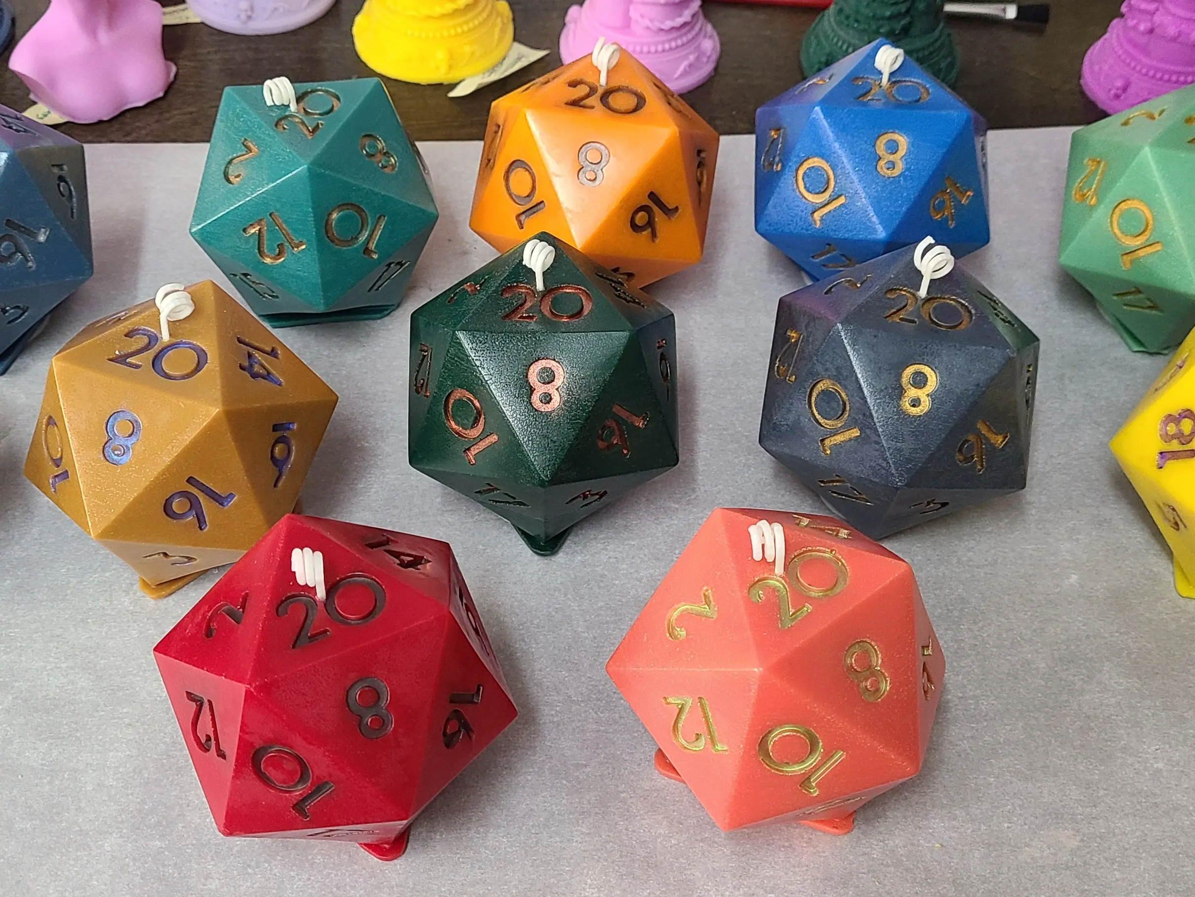 Shaped like a D20 playing die, these parasoy candles are hand-painted in various ways using: