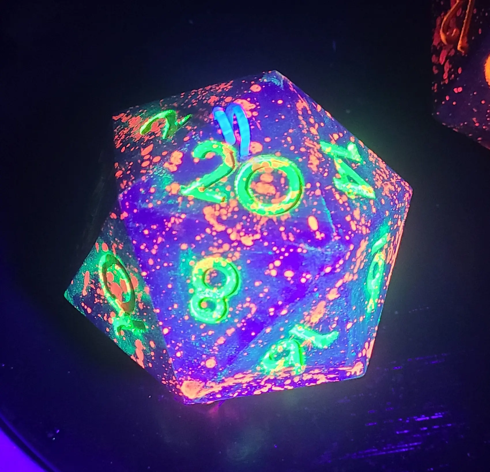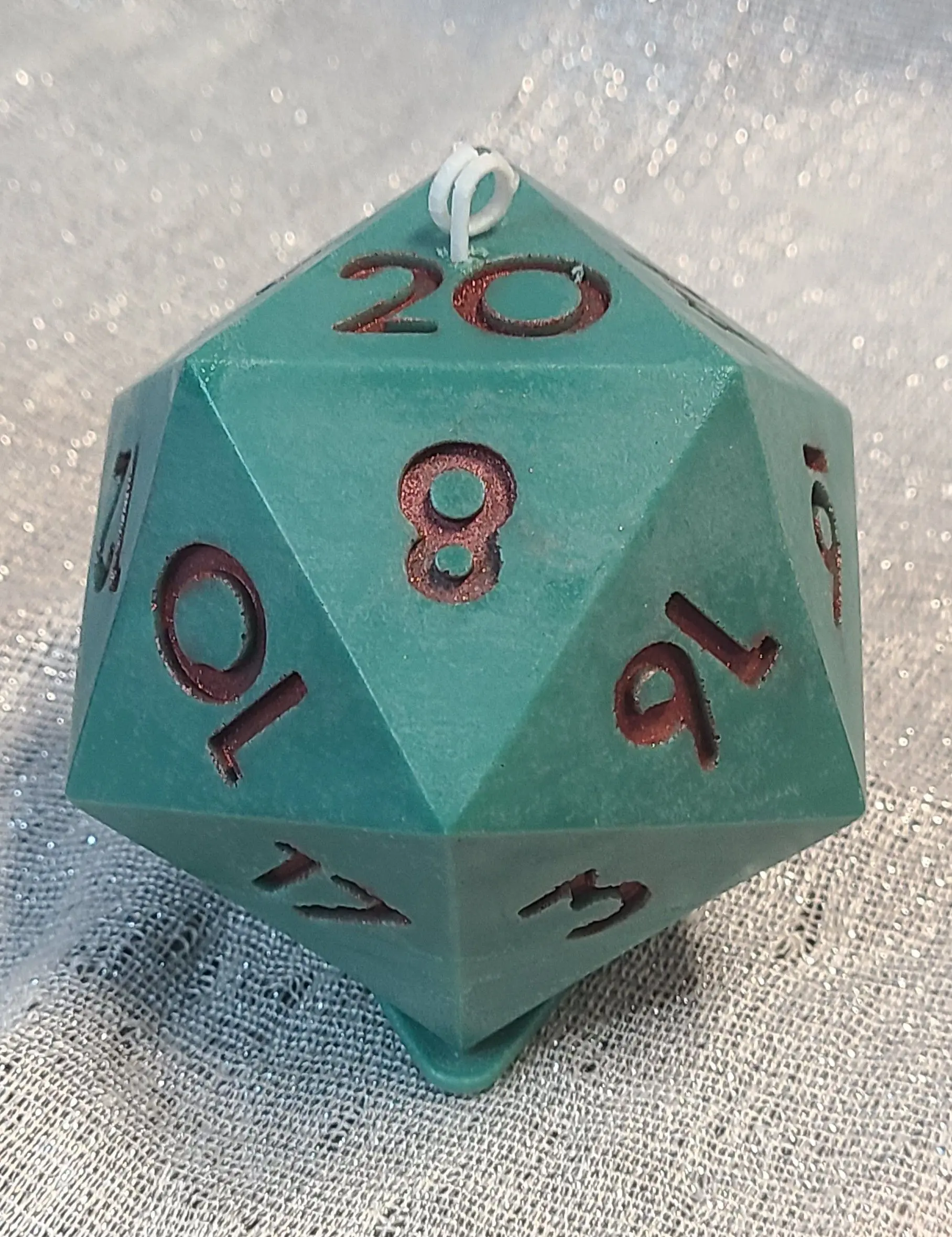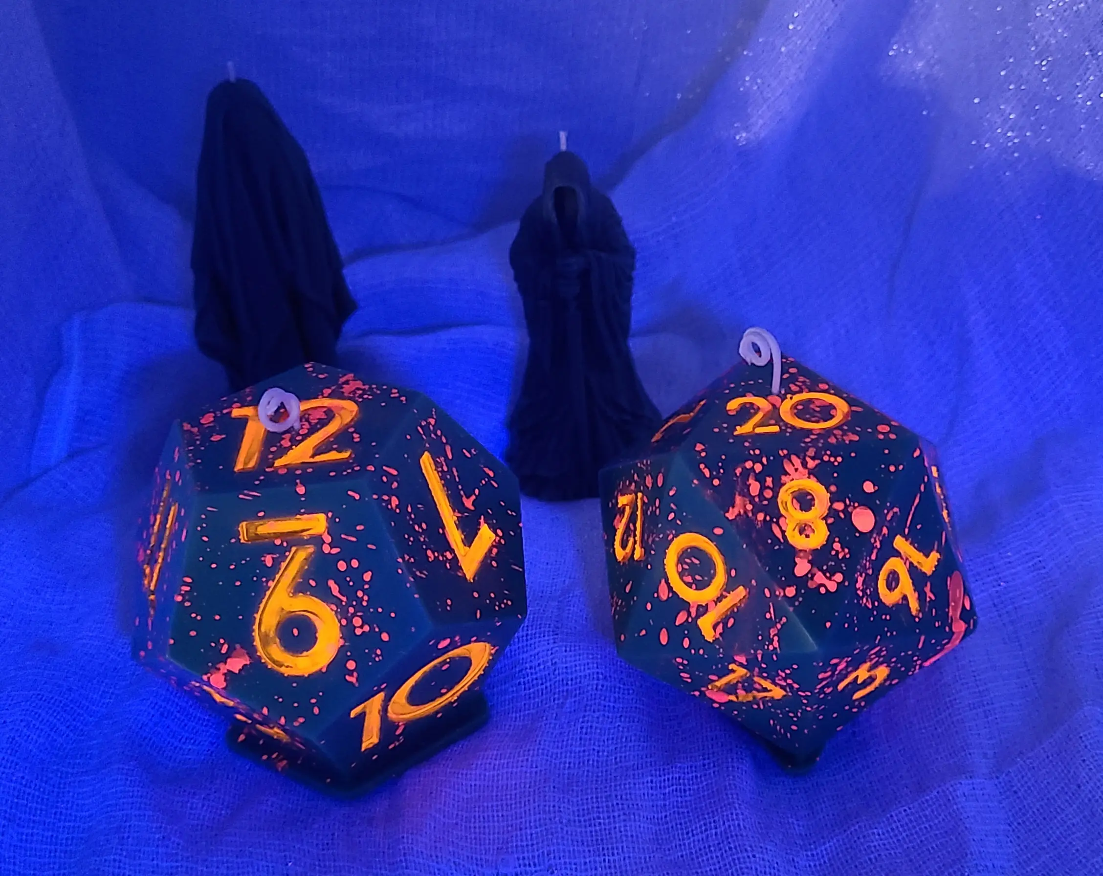 Shaped like a D20 playing die, these parasoy candles are hand-painted in various ways using:
