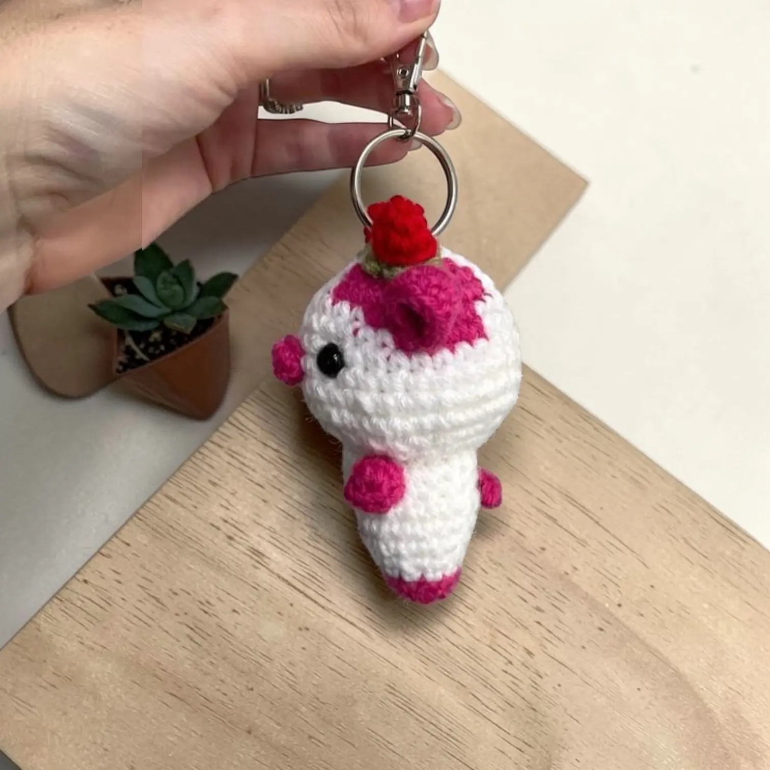 This handmade crochet keychain is a charming gift for her, him, mom, or dad. Crafted with care, it features a delightful strawberry cow design. Ideal for adding a touch of whimsy to your keys. 🐄🍓