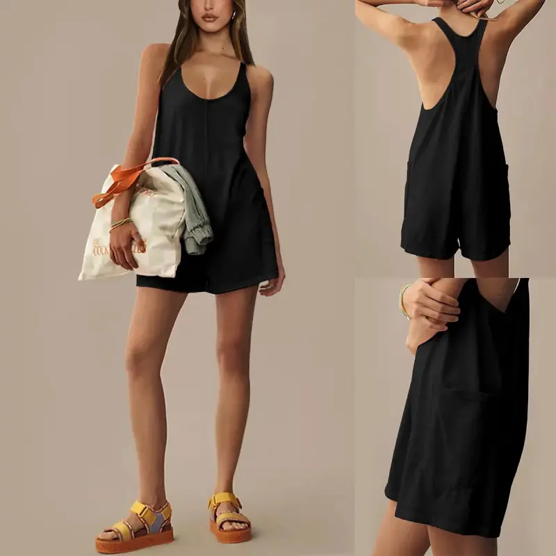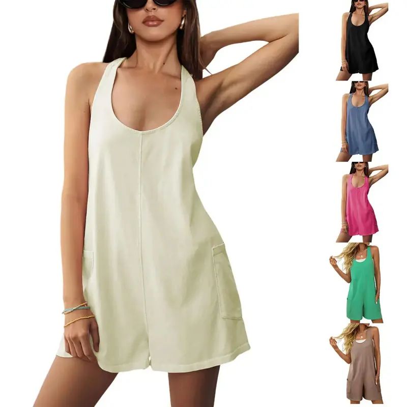 Loose and relaxed fit rompers, sleeveless, racerback cut, baggy style, two side patch pockets, solid color, short jumpers casual summer outfits