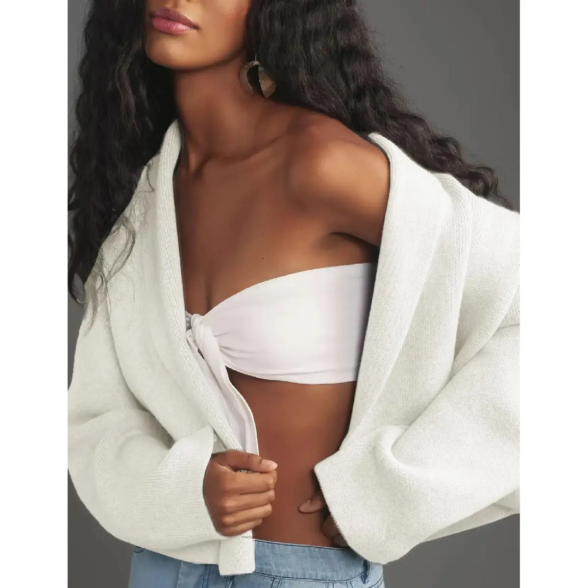 Modern cropped silhouette with an elegant open front.