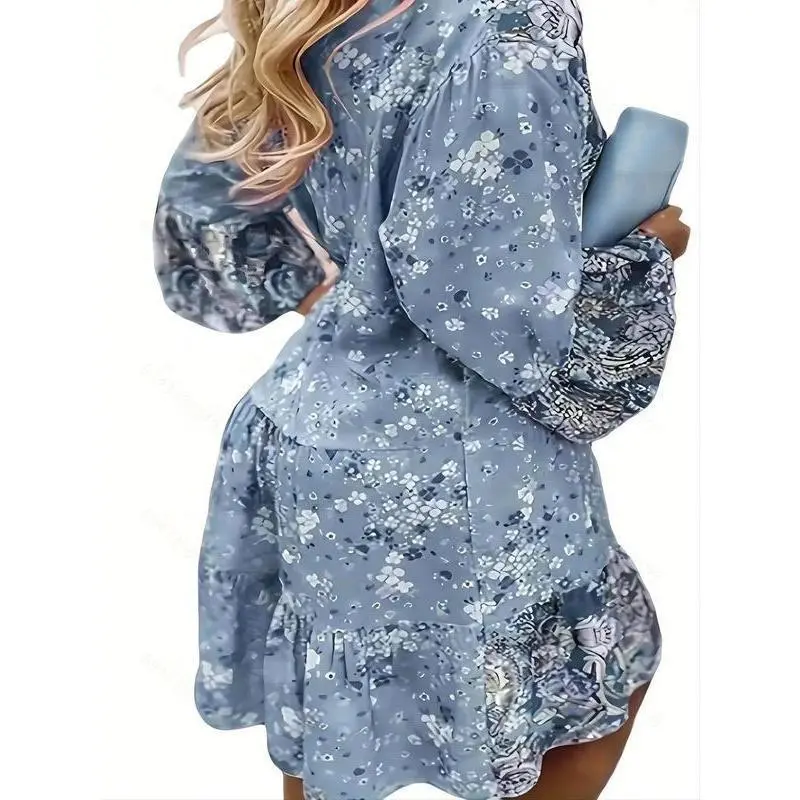 Women's Solid Ruffle Trim Blouse & Shorts Two-Piece Set, Casual Bishop Sleeve Long Sleeve Top & Shorts for Daily Wear, Ladies Two-piece Outfits for Summer