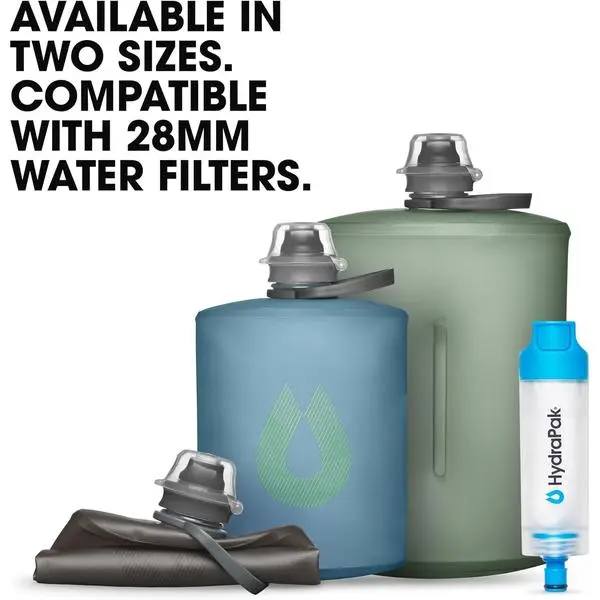 Attaches to HydraPak 28mm filter kit, ideal for backpacking, camping, or off-grid travel. Flexible bail handle for comfortable carrying. Compact enough to stash in pockets, pouches, or small packs. Reliable for everyday and backcountry use.