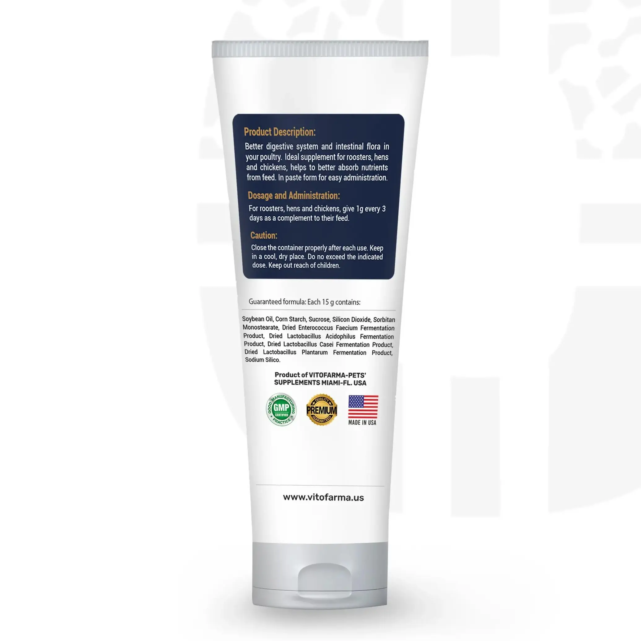 For roosters, hens and chicken, give 1g every 3 days as complement to their feed.