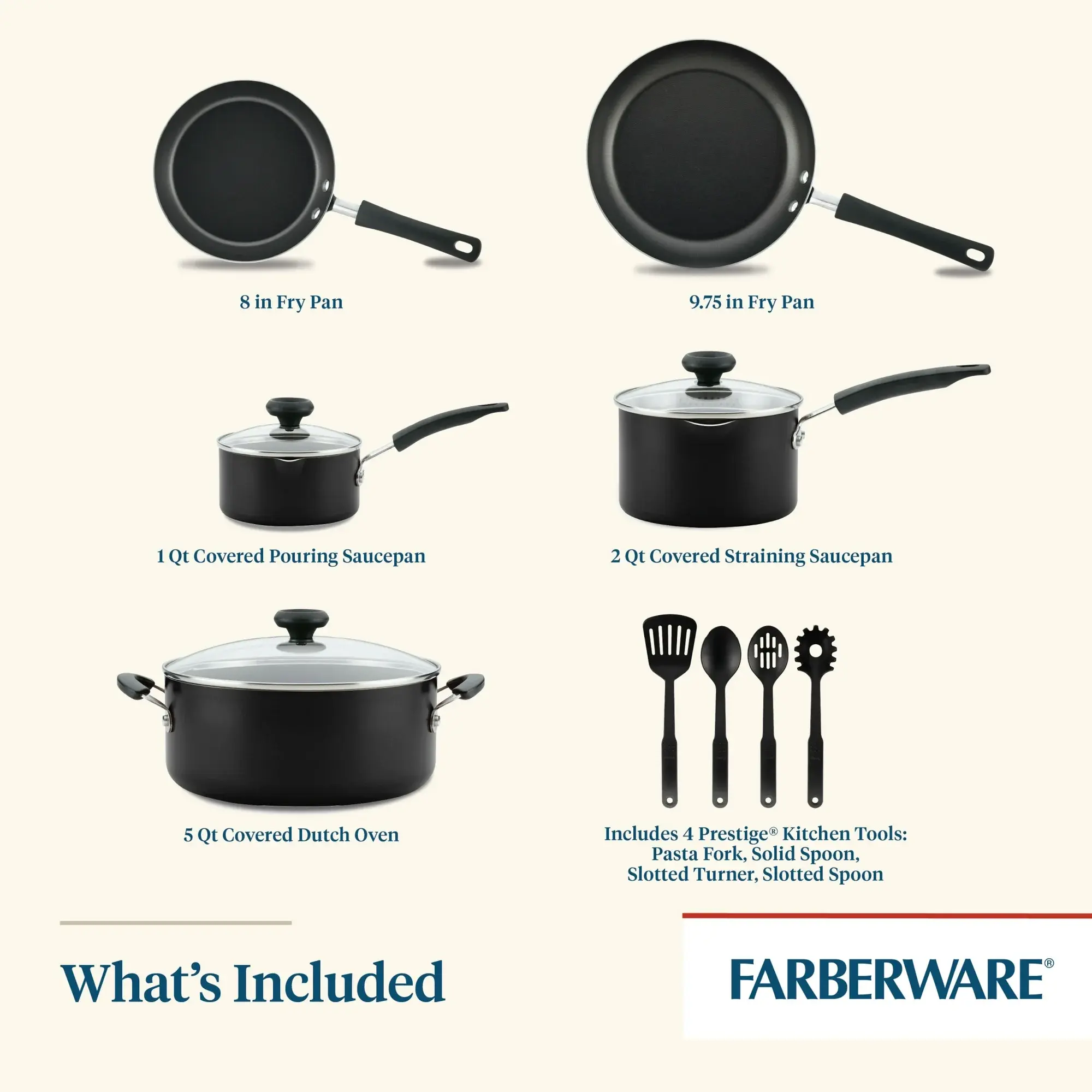 ·READY TO SERVE: The pots and pans come with four nonstick-safe Prestige nylon kitchen tools and a Farberware Quality Assurance Guarantee