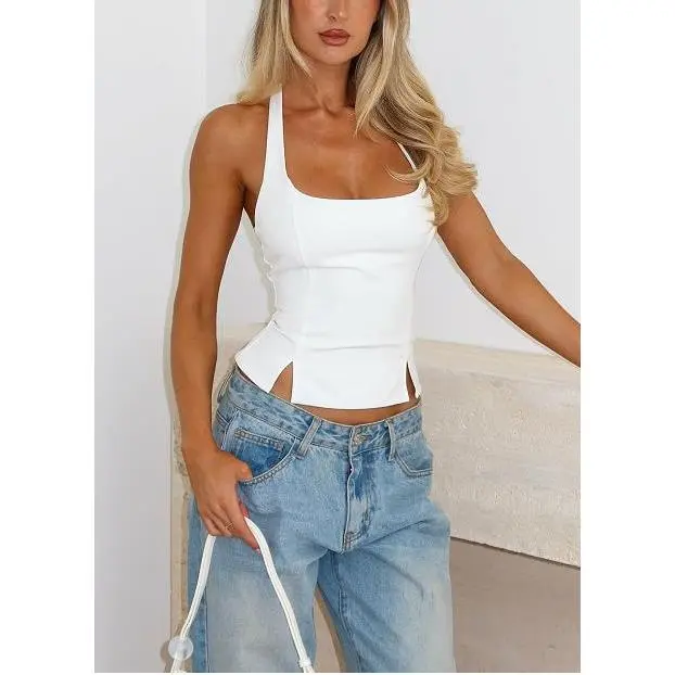 Womens Halter Tank Tops Sleeveless Square Neck Fitted Top Summer Going Out Tops with Side Slits Y2k Outfits