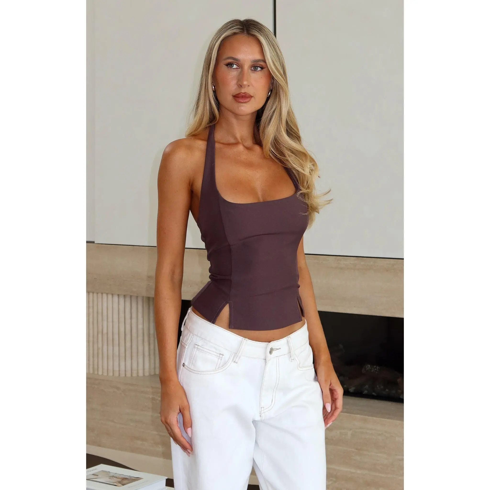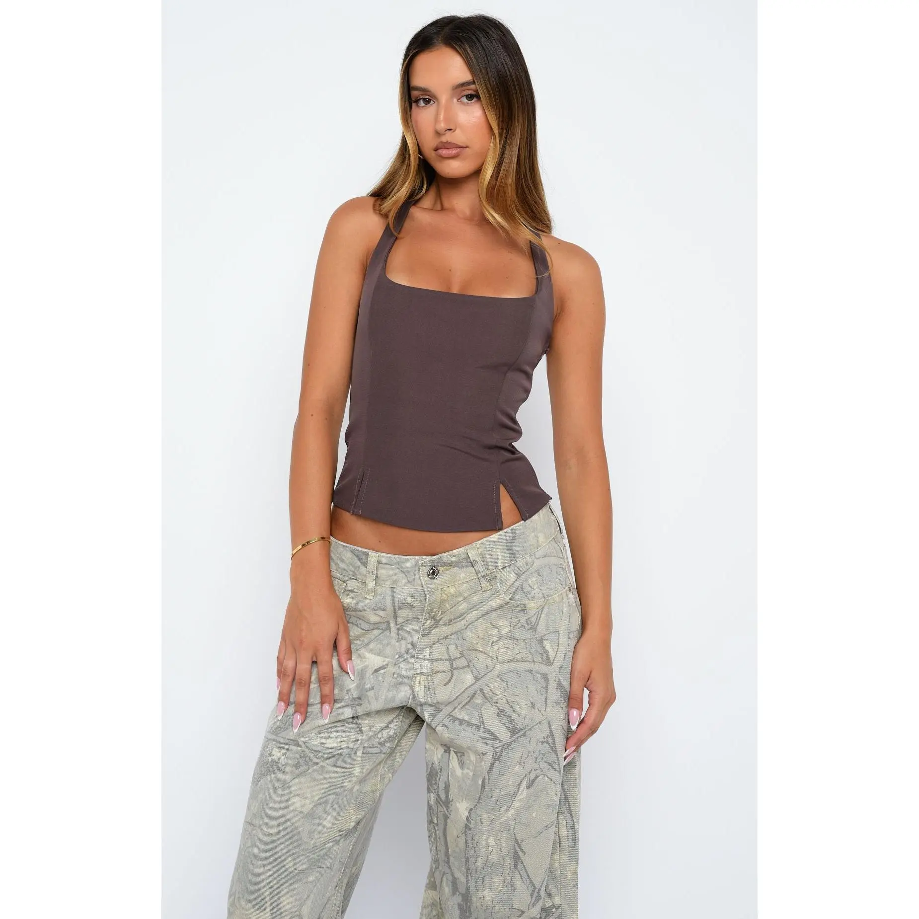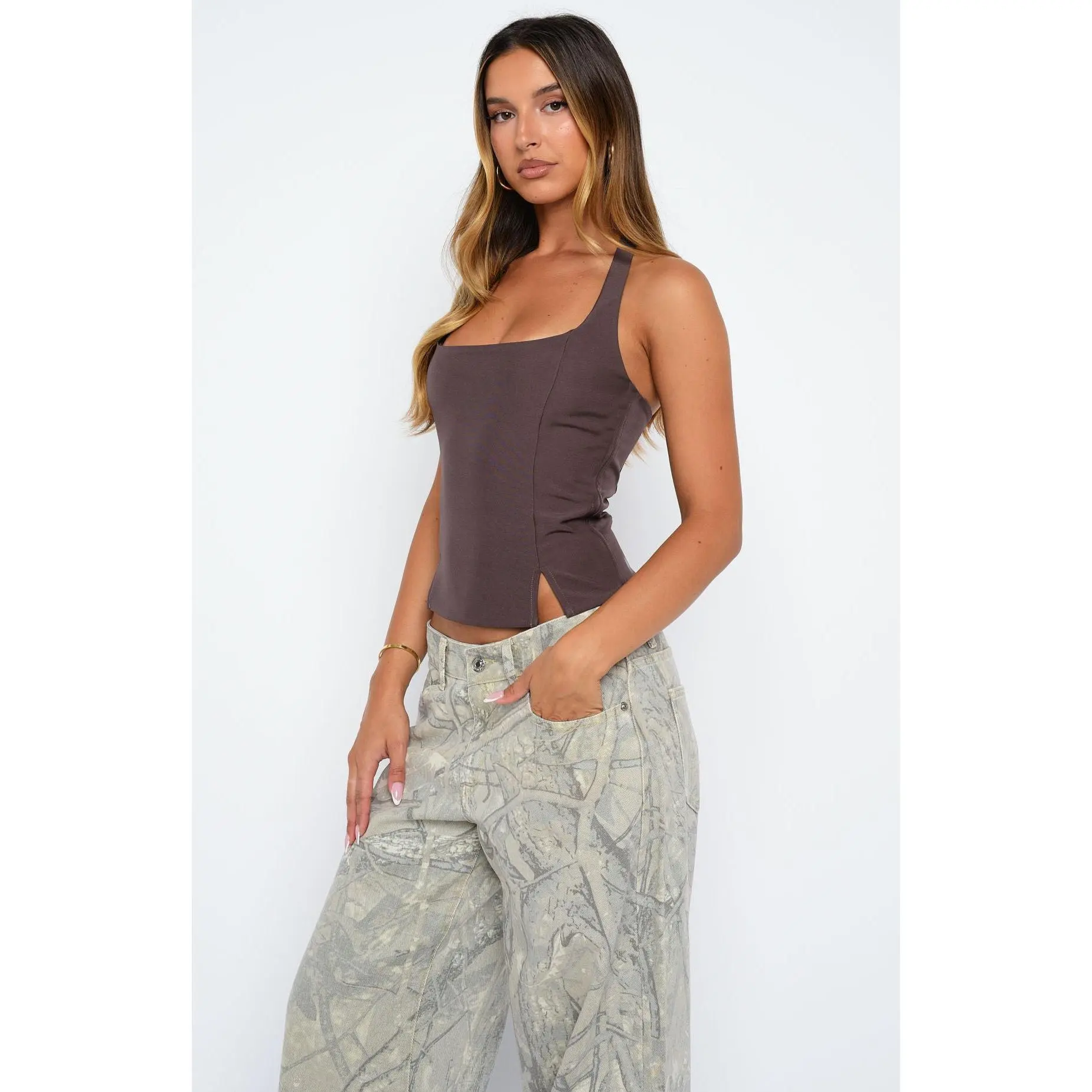 Key Points4: Say goodbye to boring basics and elevate your style with our fashionable tank tops. The deep brown and white colors add a touch of sophistication to your outfit, making you stand out from the crowd.
