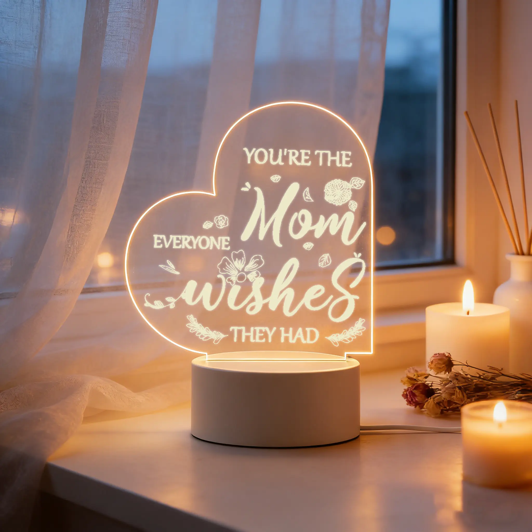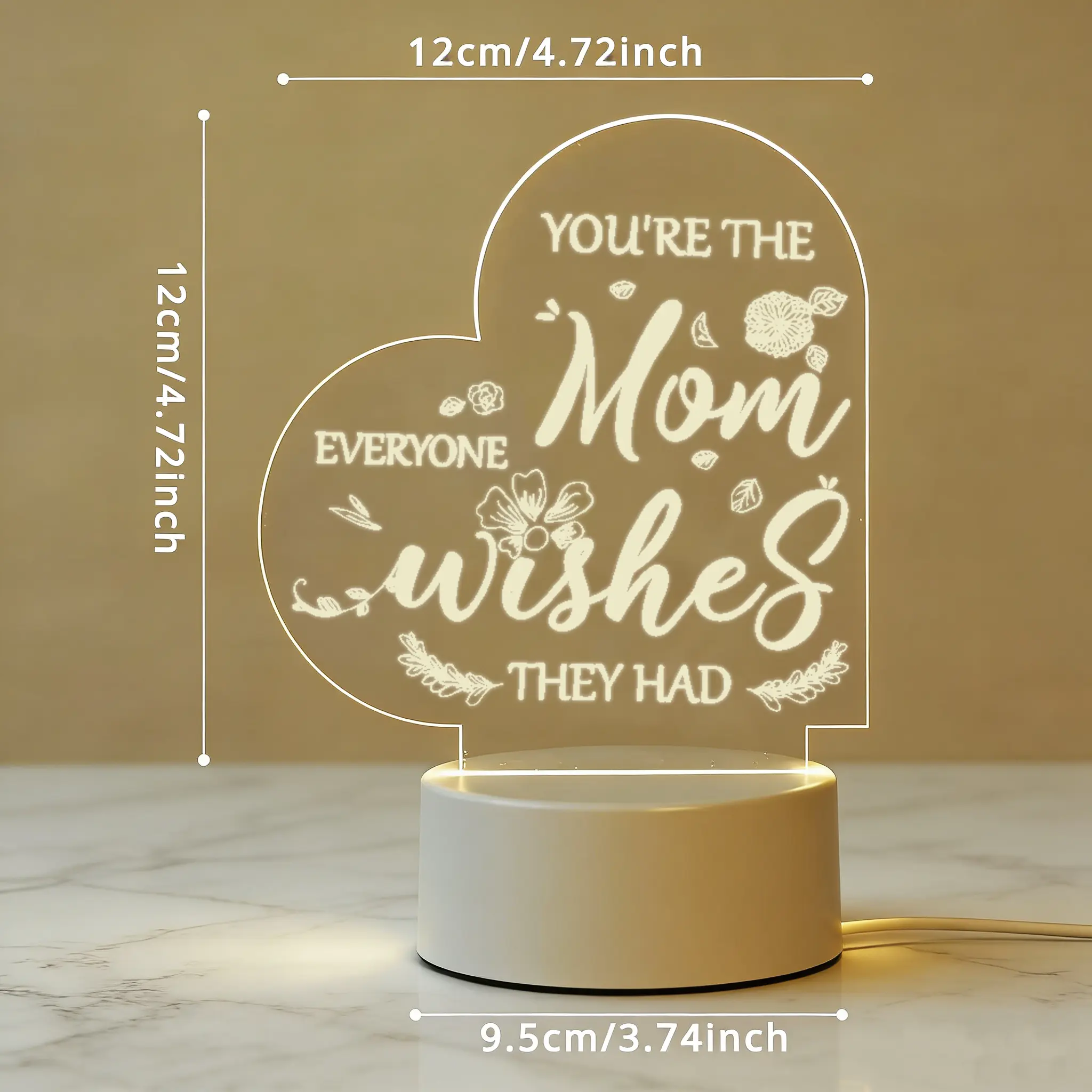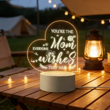 Celebrate the amazing mom in your life with this heartfelt 2D acrylic LED night light! Engraved with the warm quote "You're The Mom Everyone Wishes They Had" and delicate floral details, this heart-shaped lamp emits a soft, cozy glow that adds a loving atmosphere to any space. Made of premium clear acrylic and a durable ABS base, it's powered by USB for easy use, making it the perfect thoughtful gift for mom on any special occasion.