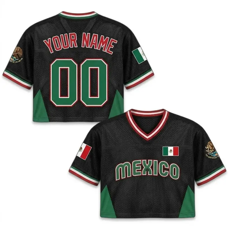 Mexico Crop Top Mesh Jersey – Personalized Name & Number, Black All Over Print Custom Jersey for Women