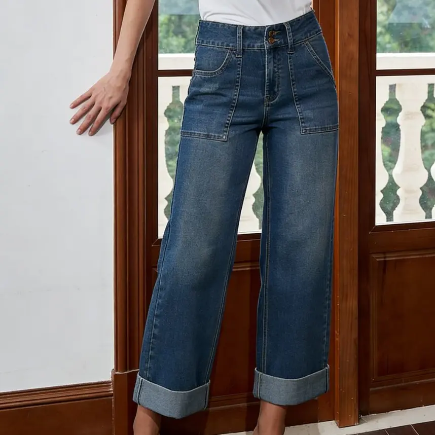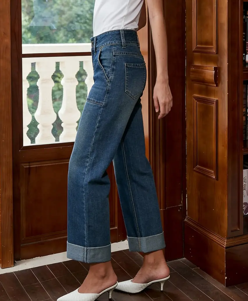 With a full length cut, these wide leg jeans are the epitome of sophistication and elongation; they create a slim profile that accentuates the waist and flatters a variety of body shapes