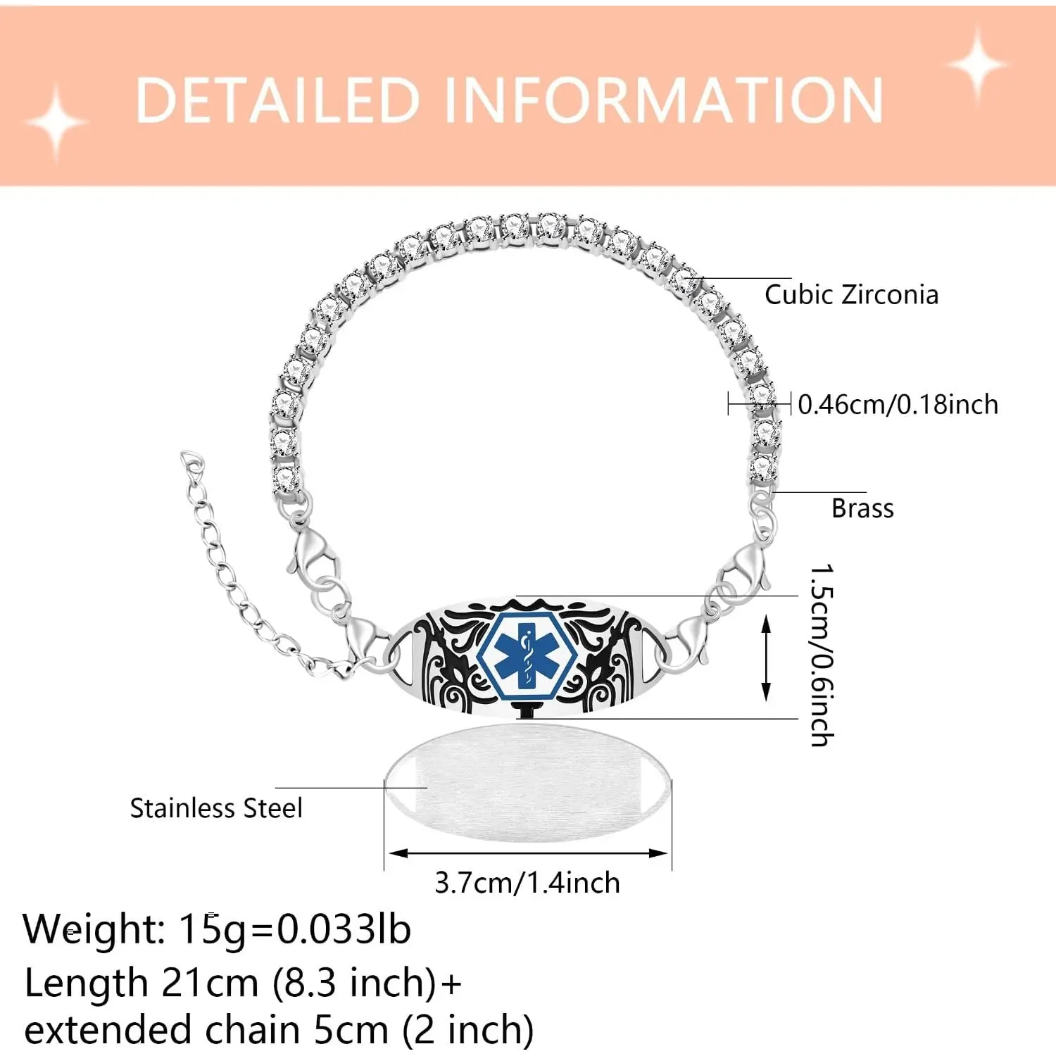 Integrates the functions of medical ID bracelet, emergency contact bracelet and allergy alert bracelet in one. Blends professional health protection with trendy tennis bracelet style—discreet protection, stylish wearing, suitable for daily life, work, parties and outdoor activities.