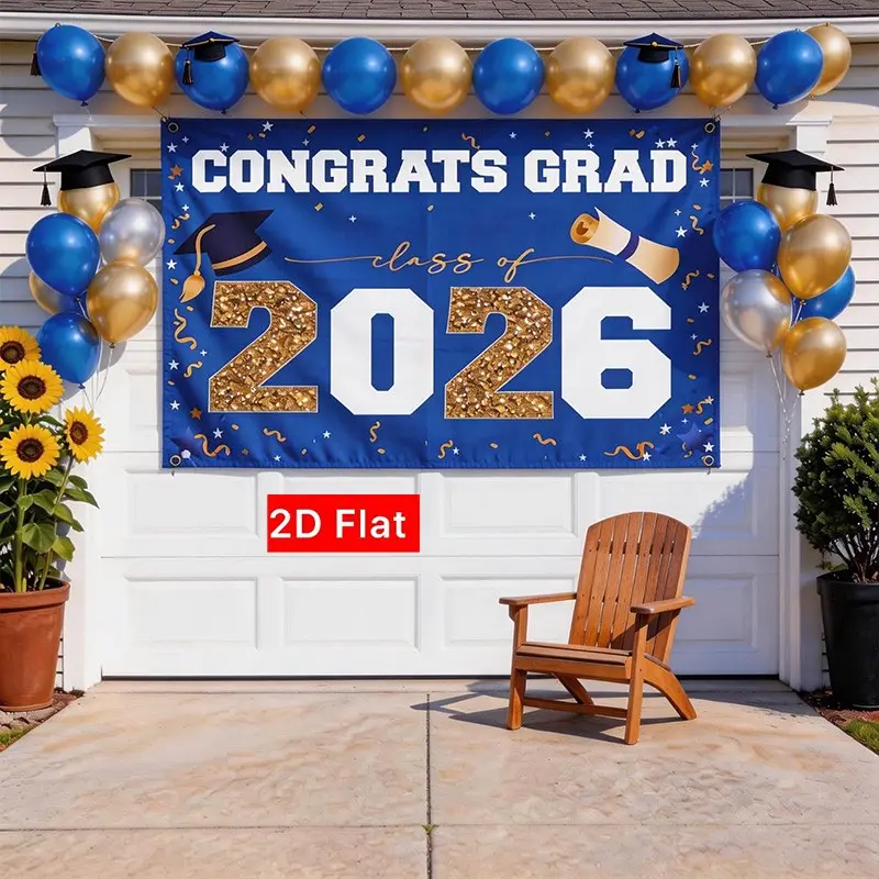 2D Flat Banner 1pc, 2026 Graduation Season Decor, Large Outdoor Flag, Blue, High School & University Party Supplies