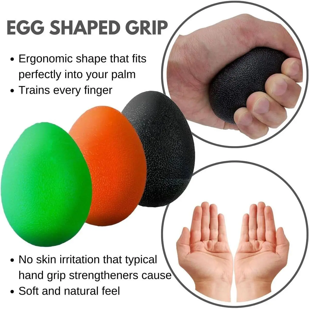 FRIENDLY DESIGN AND DURABILITY: Egg-shaped for a comfortable fit in your hands. Made of skin-safe thermoplastic rubber (TPR). Three size options - for anyone in the family! XS: 2”x1.3” Small: 2.5" x 1.75" Large: 3.0" x 2.2". Less messy than Therapy Putty. Easy to clean from dust and dirt.