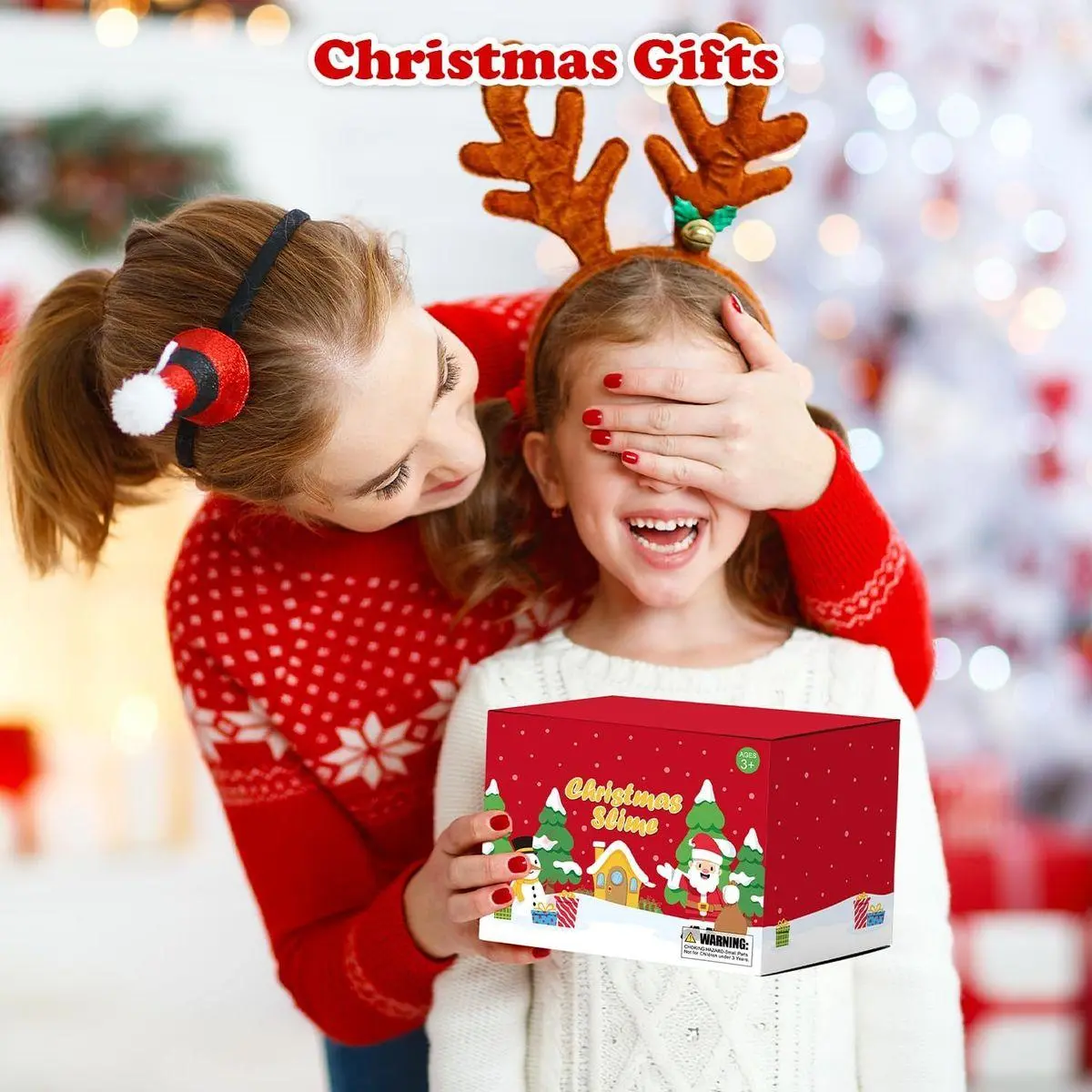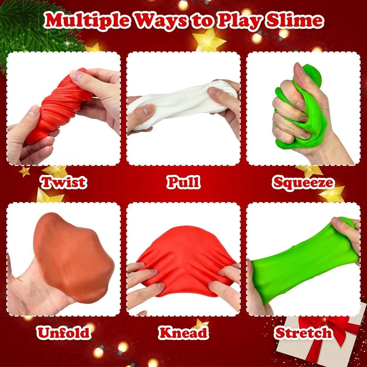 Christmas Slime Kit: Including 4 cans of slime (in white, green, red, and brown), along with individually packaged Christmas-themed charms such as Santa, stocking, holly leaves and berries, Tree, snowman, gift box, reindeer and gingerbread man.